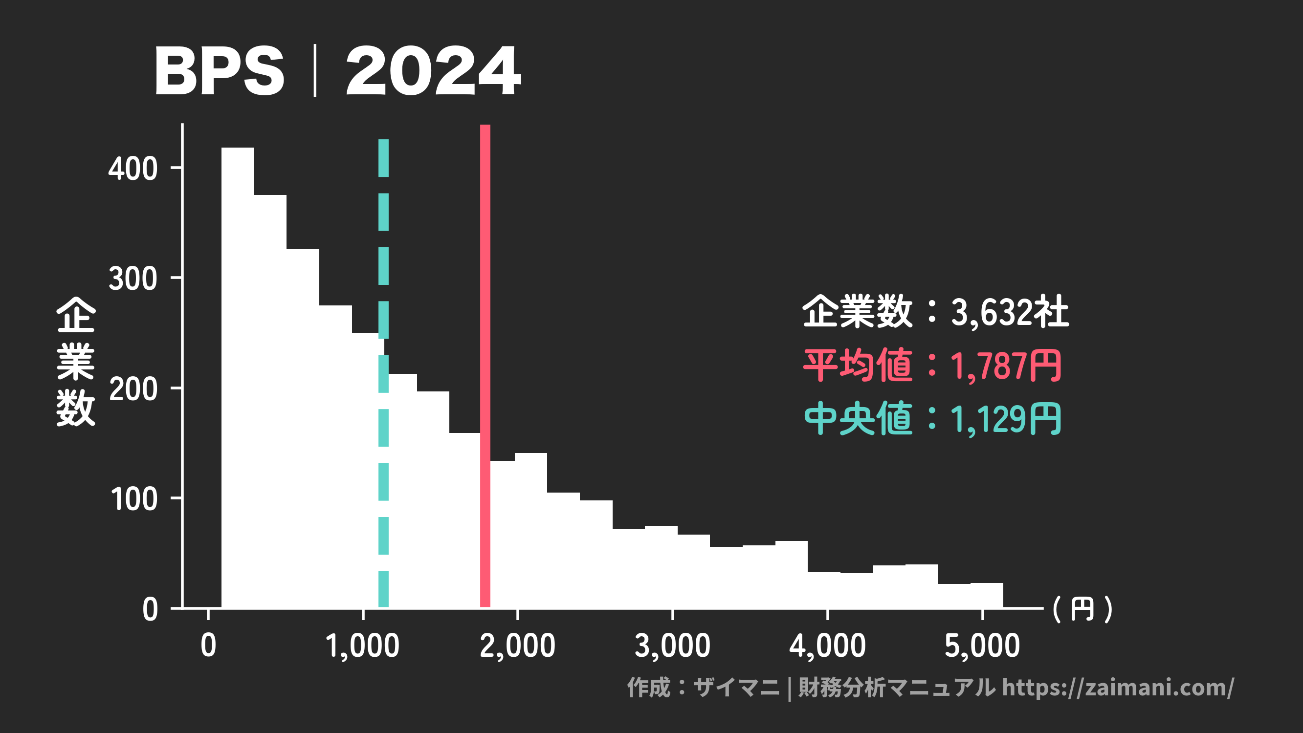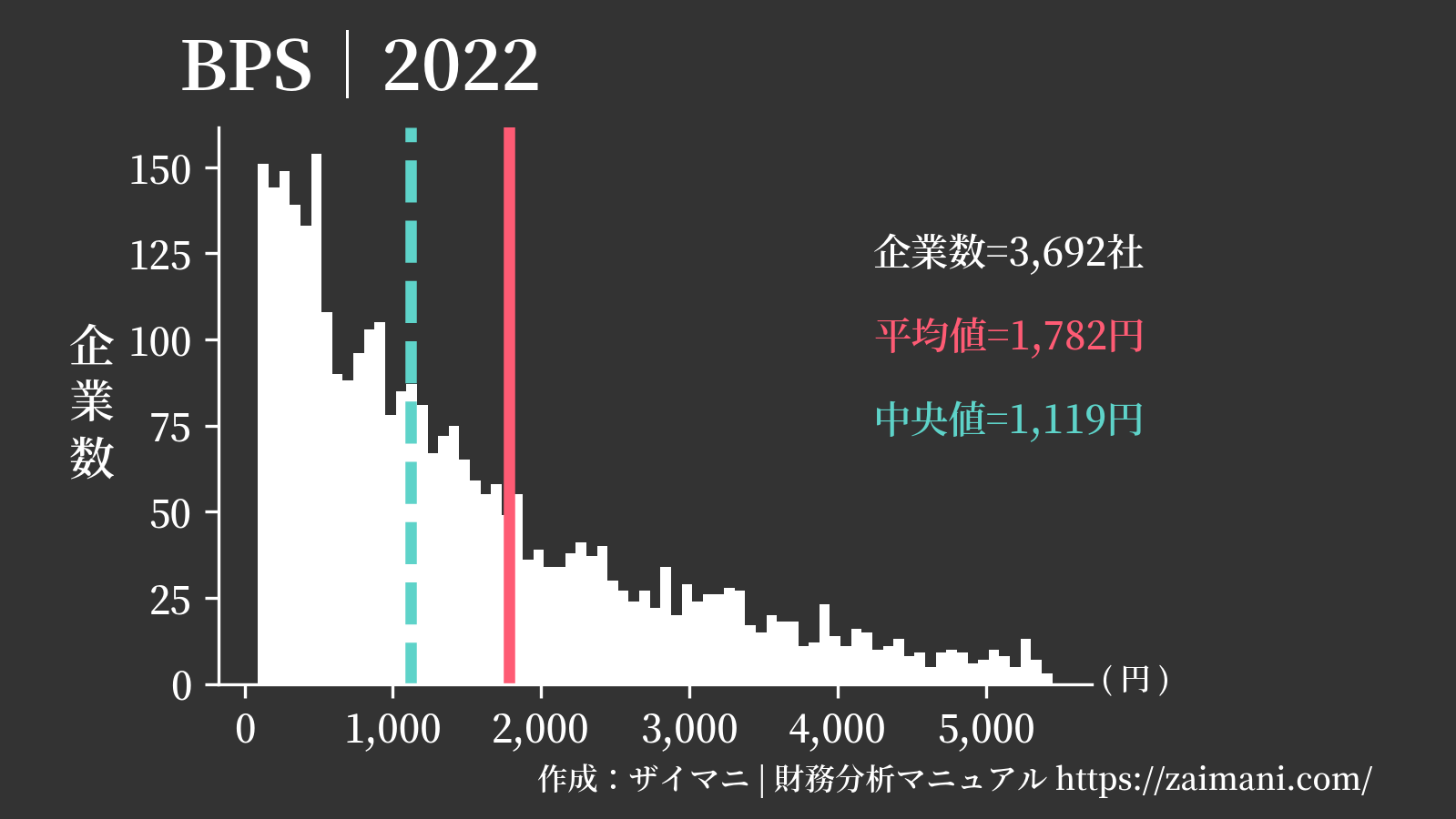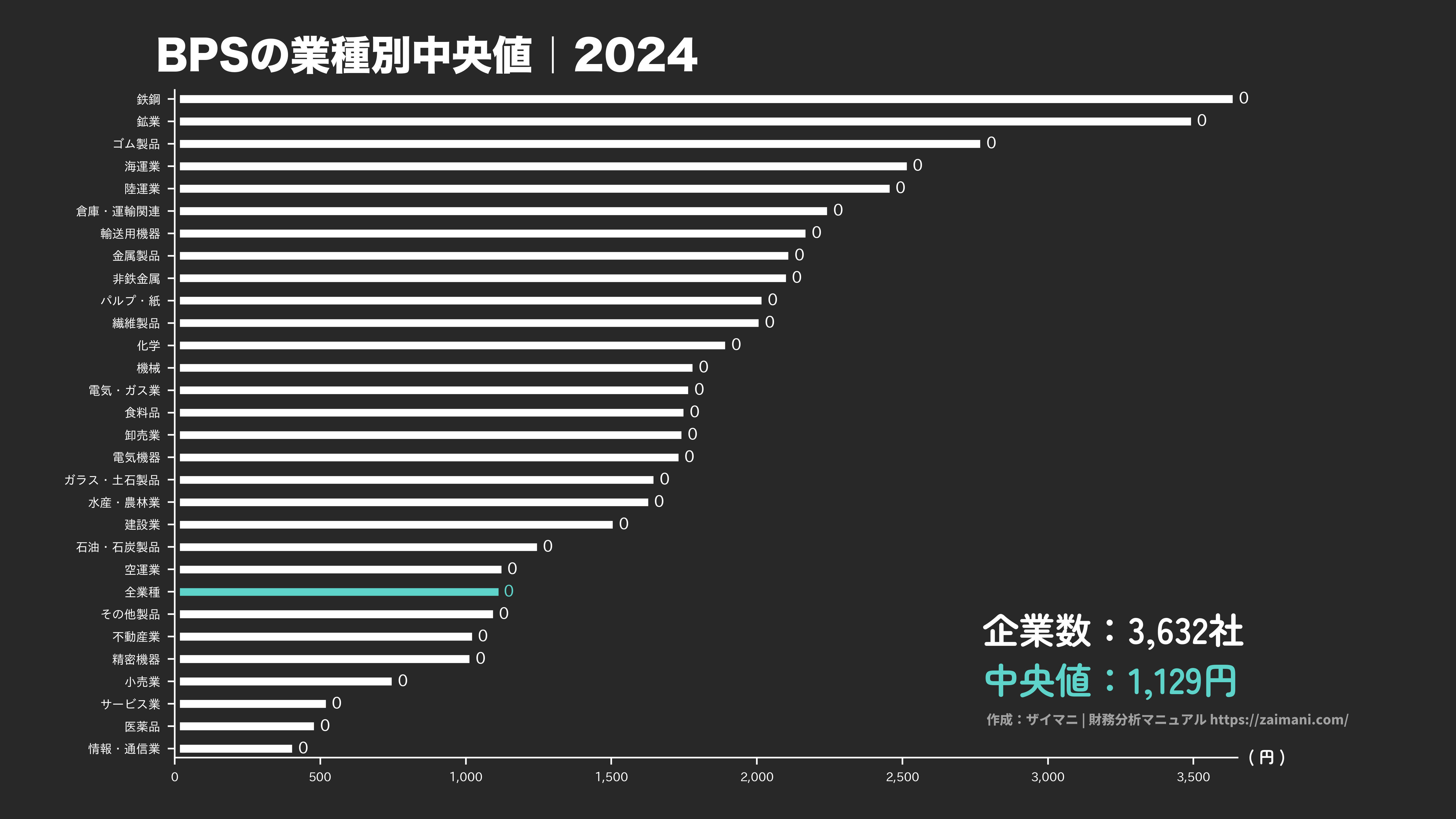 BPSとは、一株当たりいくらの純資産があるかを測定する指標です。計算式は「BPS(円) = 純資産 ÷ 発行済株式数」であり、全業種の中央値(目安)は1,129円です。
