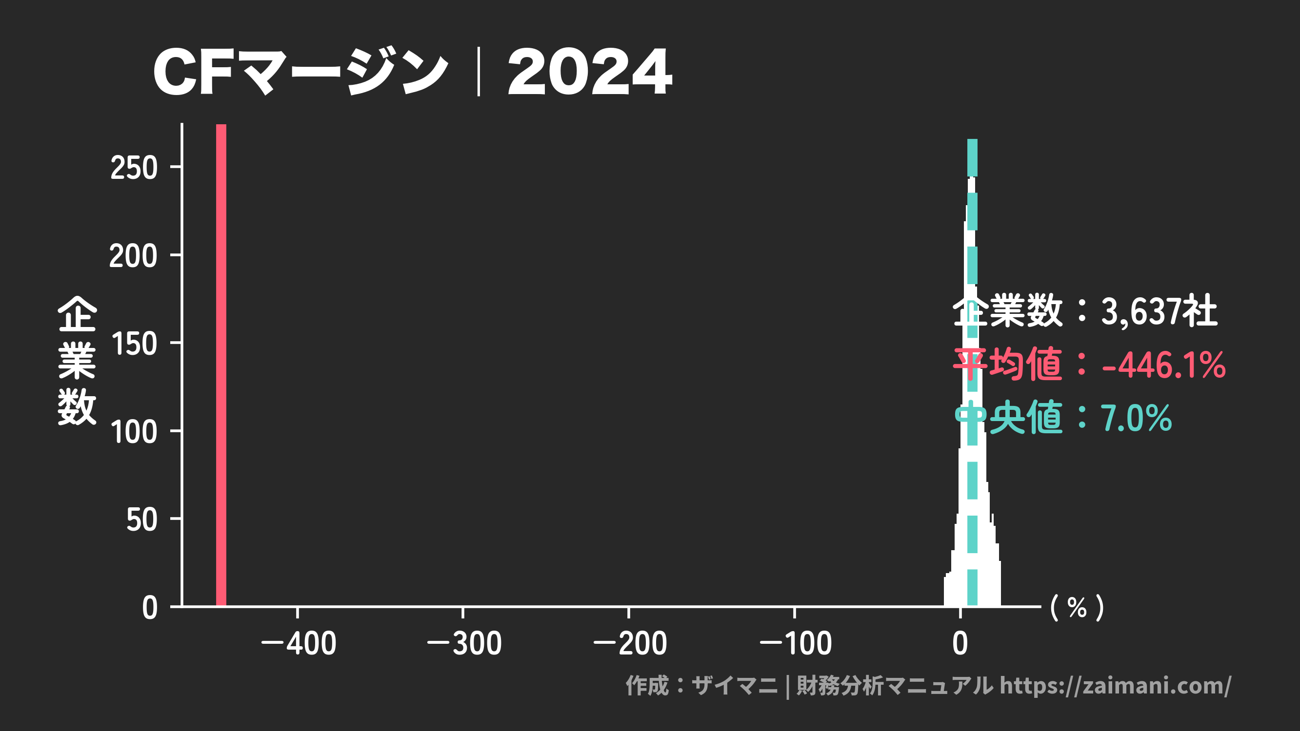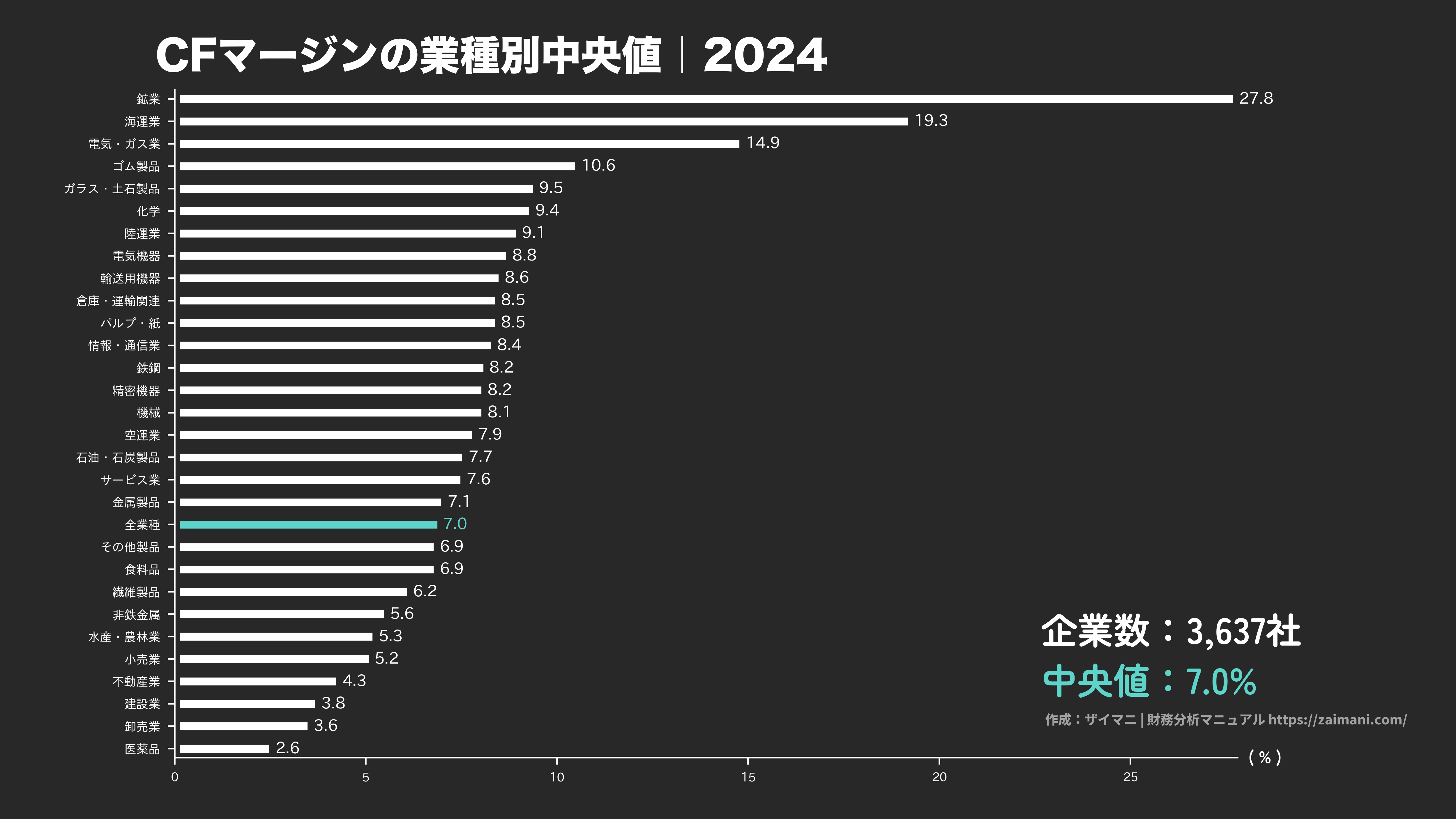 キャッシュフローマージンとは、キャッシュ創出力を測定する指標です。計算式は「キャッシュフローマージン(%) = 営業CF ÷ 売上高」であり、全業種の中央値(目安)は7%です。