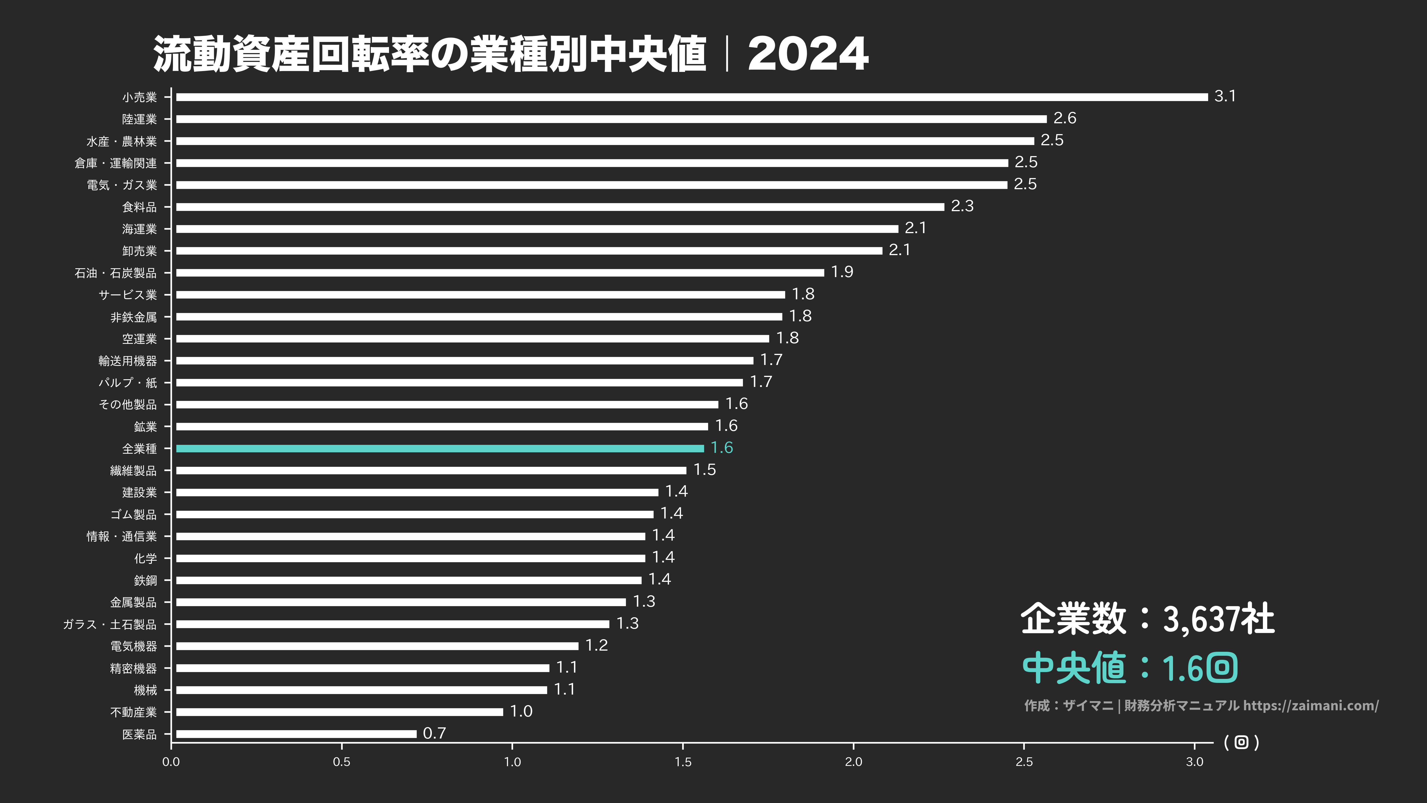 流動資産回転率とは、流動資産がどれだけ効率的に売上高を生み出しているかを測定する指標です。計算式は「流動資産回転率(回) = 売上高 ÷ 流動資産」であり、全業種の中央値(目安)は1.6回です。