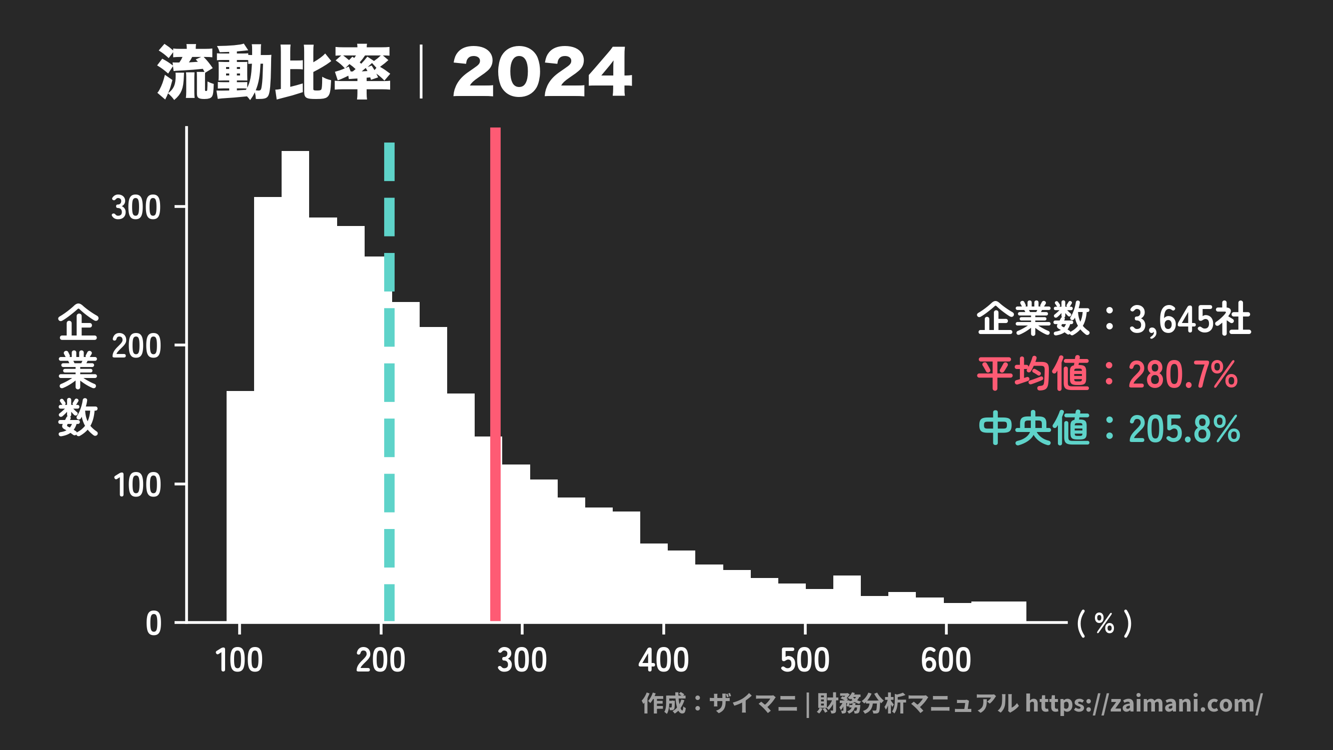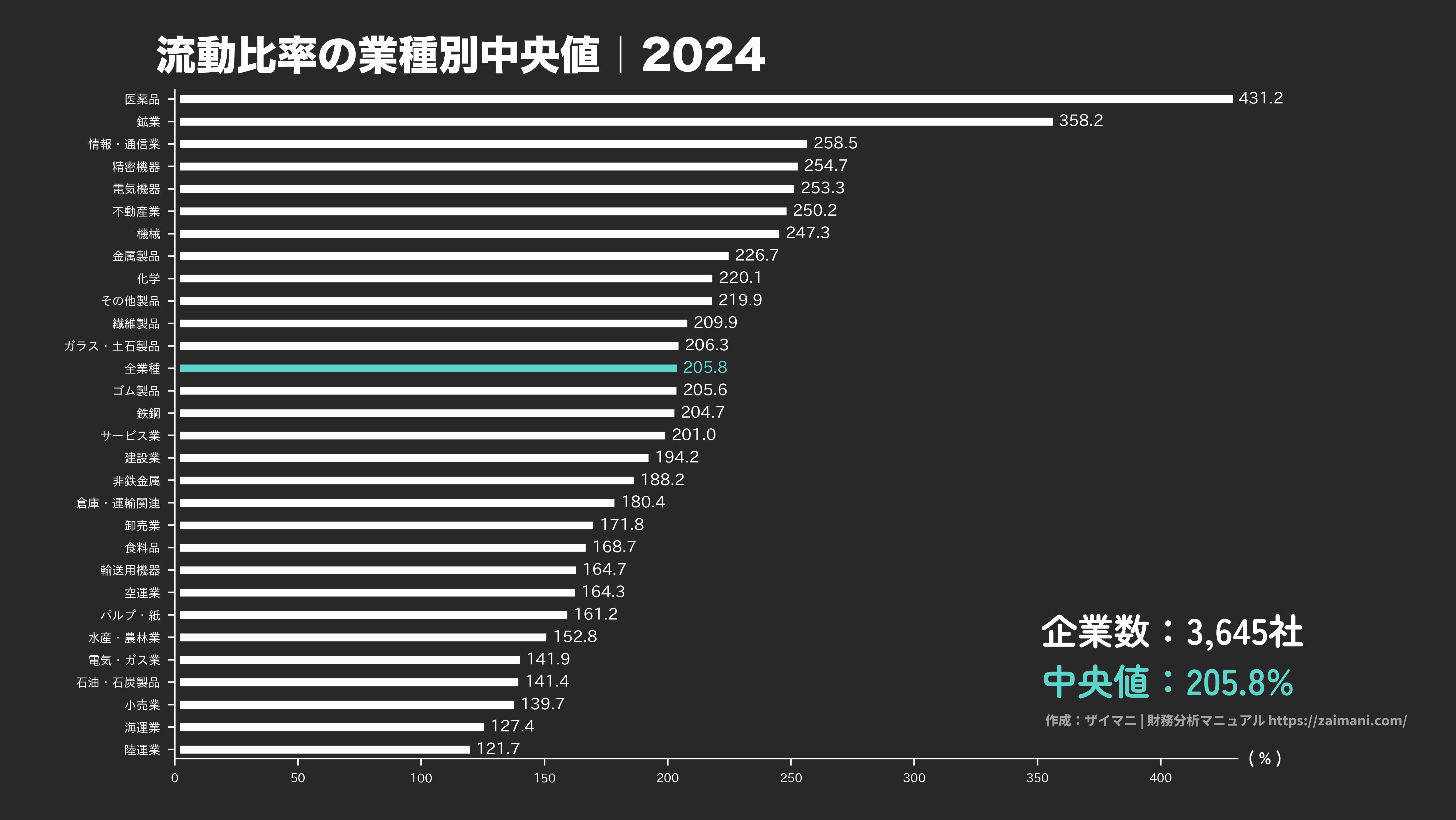 流動比率とは、短期的な財務安全性を測定する指標です。計算式は「流動比率(%) = 流動資産 ÷ 流動負債」であり、全業種の中央値(目安)は205.8%です。