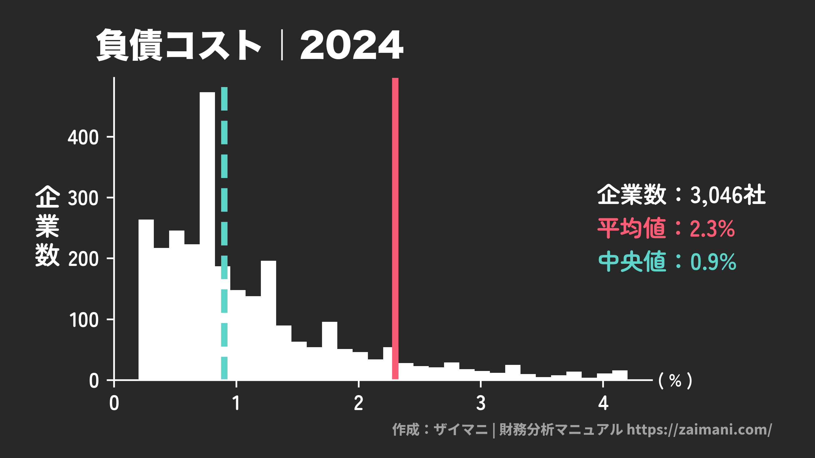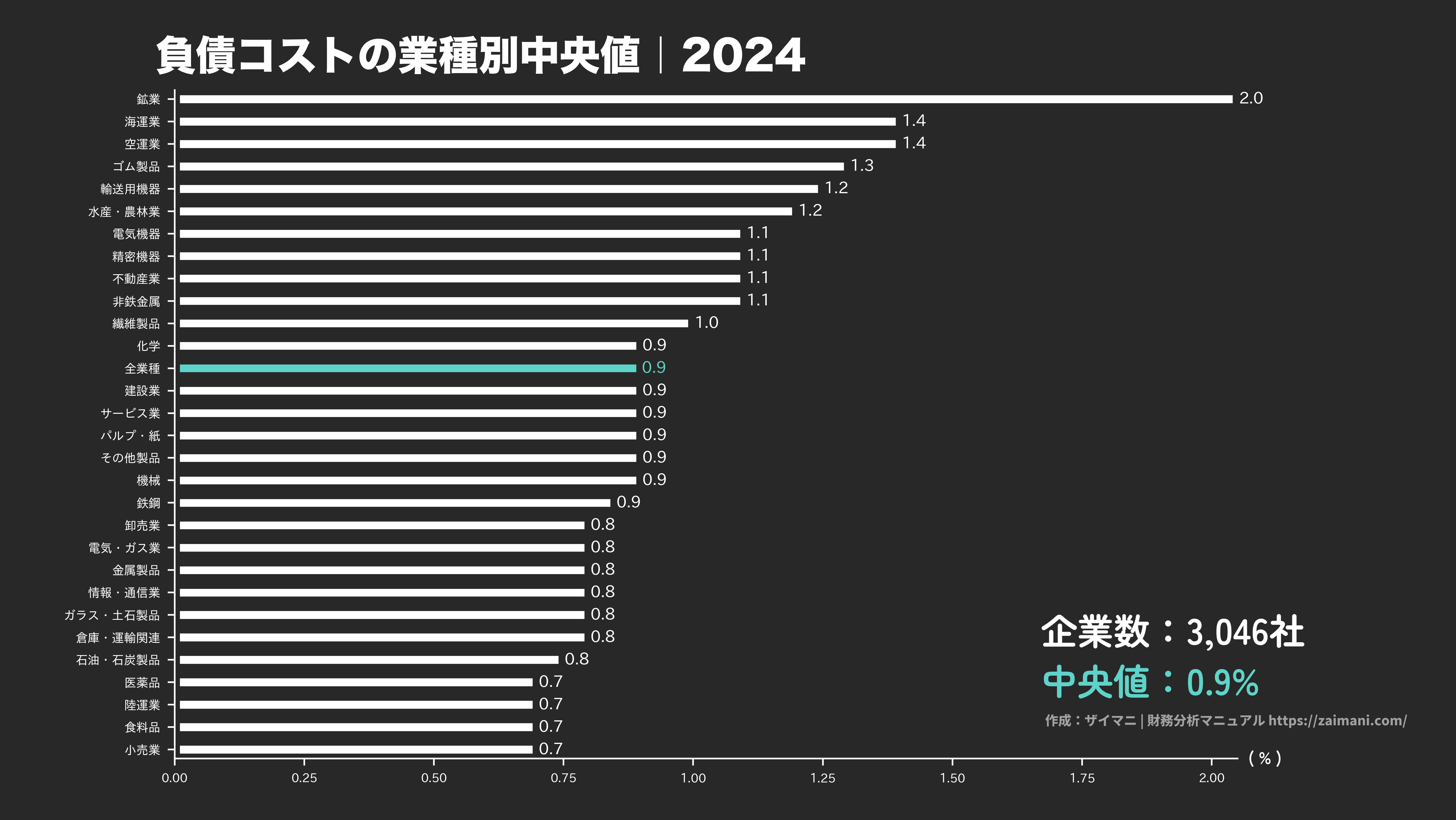 負債コストとは、銀行など債権者から調達した資本に対して、企業が毎年支払いを約束しているコスト(利息)の割合です。計算式は「負債コスト(%) = 支払利息 ÷ 有利子負債」であり、全業種の中央値(目安)は0.9%です。