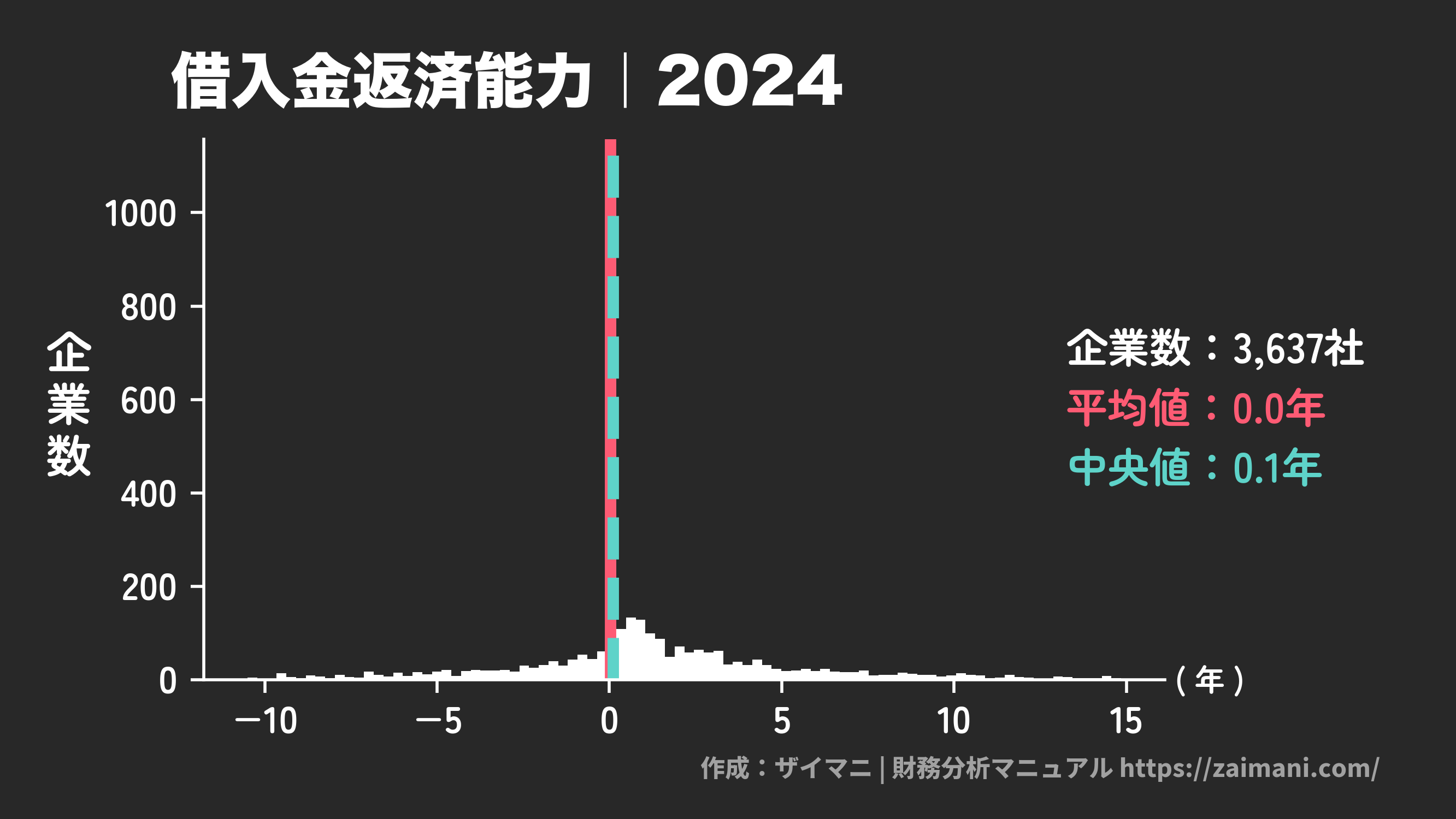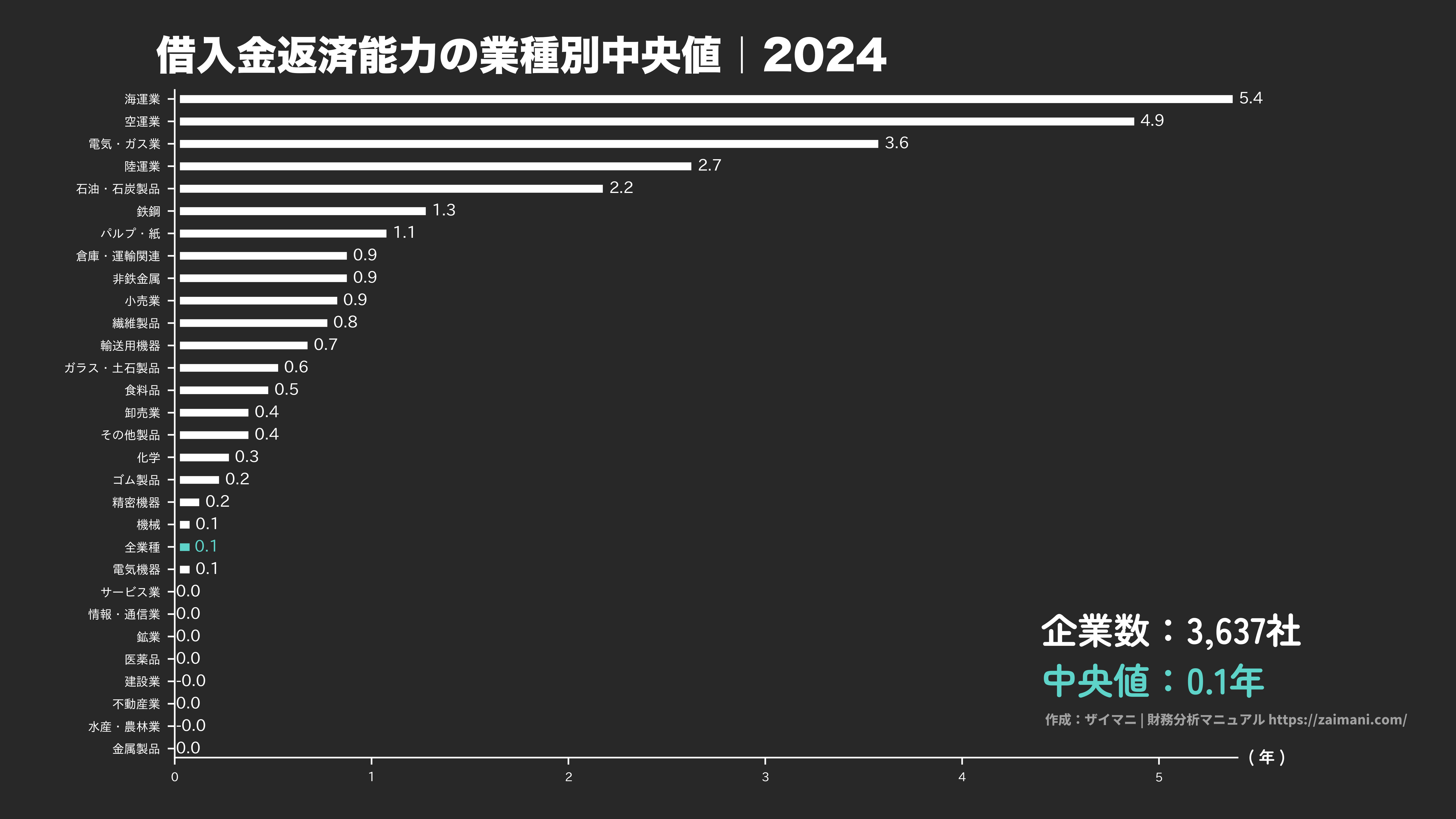 借入金返済能力とは、短期・長期の借入金を何年分のFCFで返済できるかを測定する指標です。計算式は「借入金返済能力(年) = (短期借入金 + 長期借入金) ÷ FCF」であり、全業種の中央値(目安)は0.1年です。