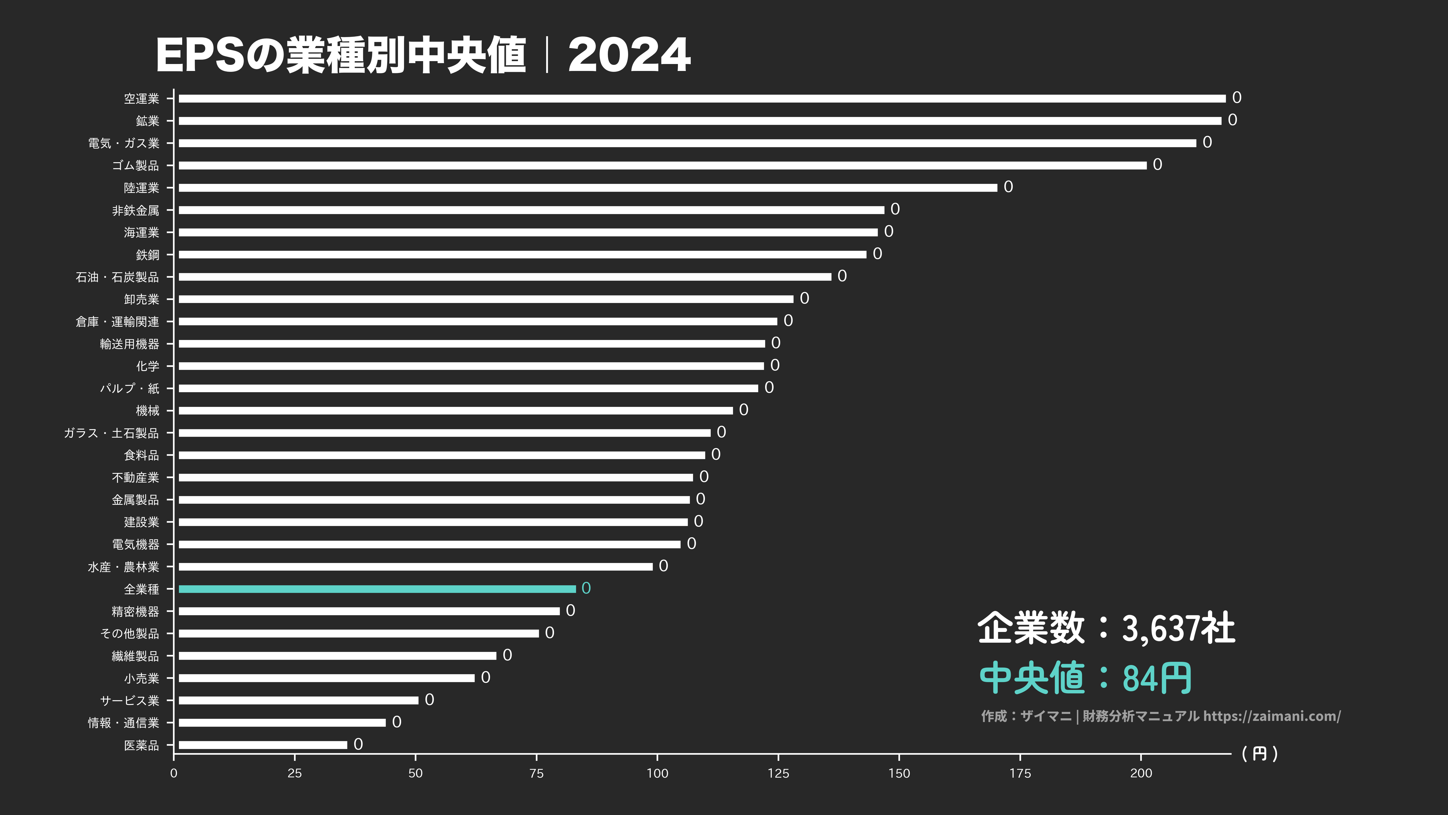 EPSとは、一株当たりいくらの純利益を生み出しているか?といった観点で株価の割安性を測定する指標です。計算式は「EPS(円) = 当期純利益 ÷ 発行済株式数」であり、全業種の中央値(目安)は84円です。