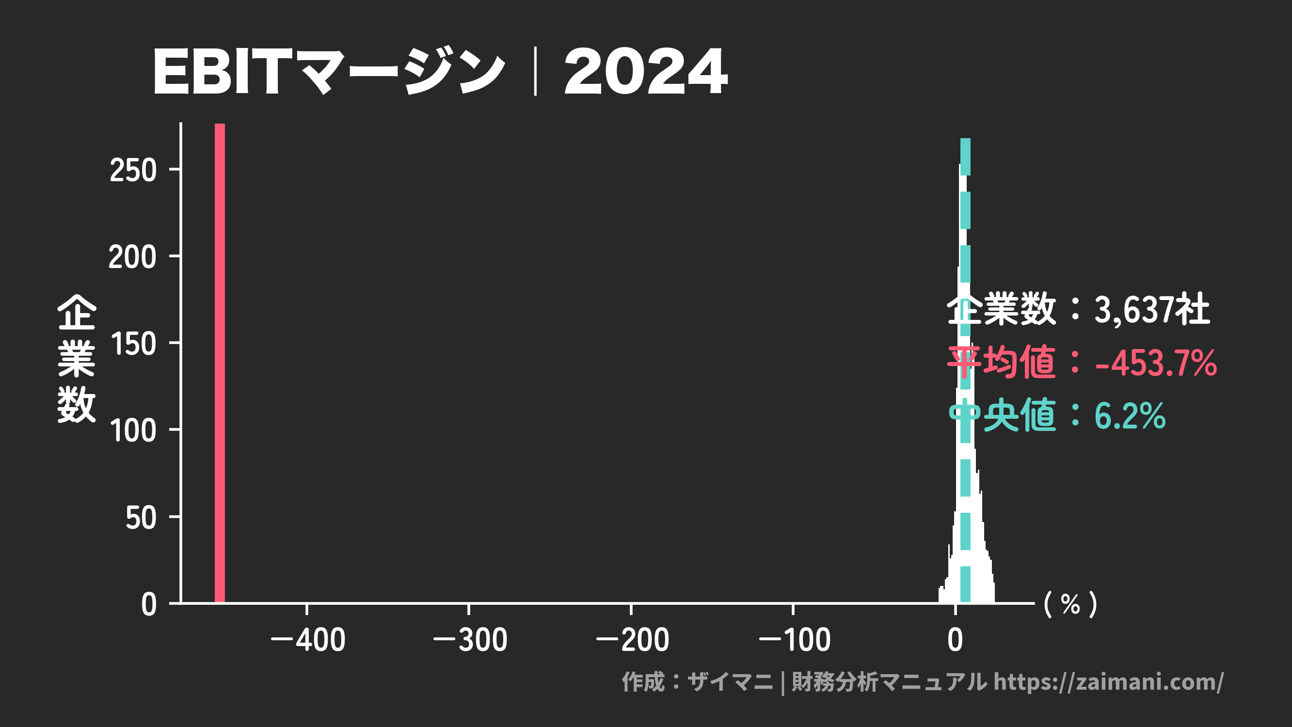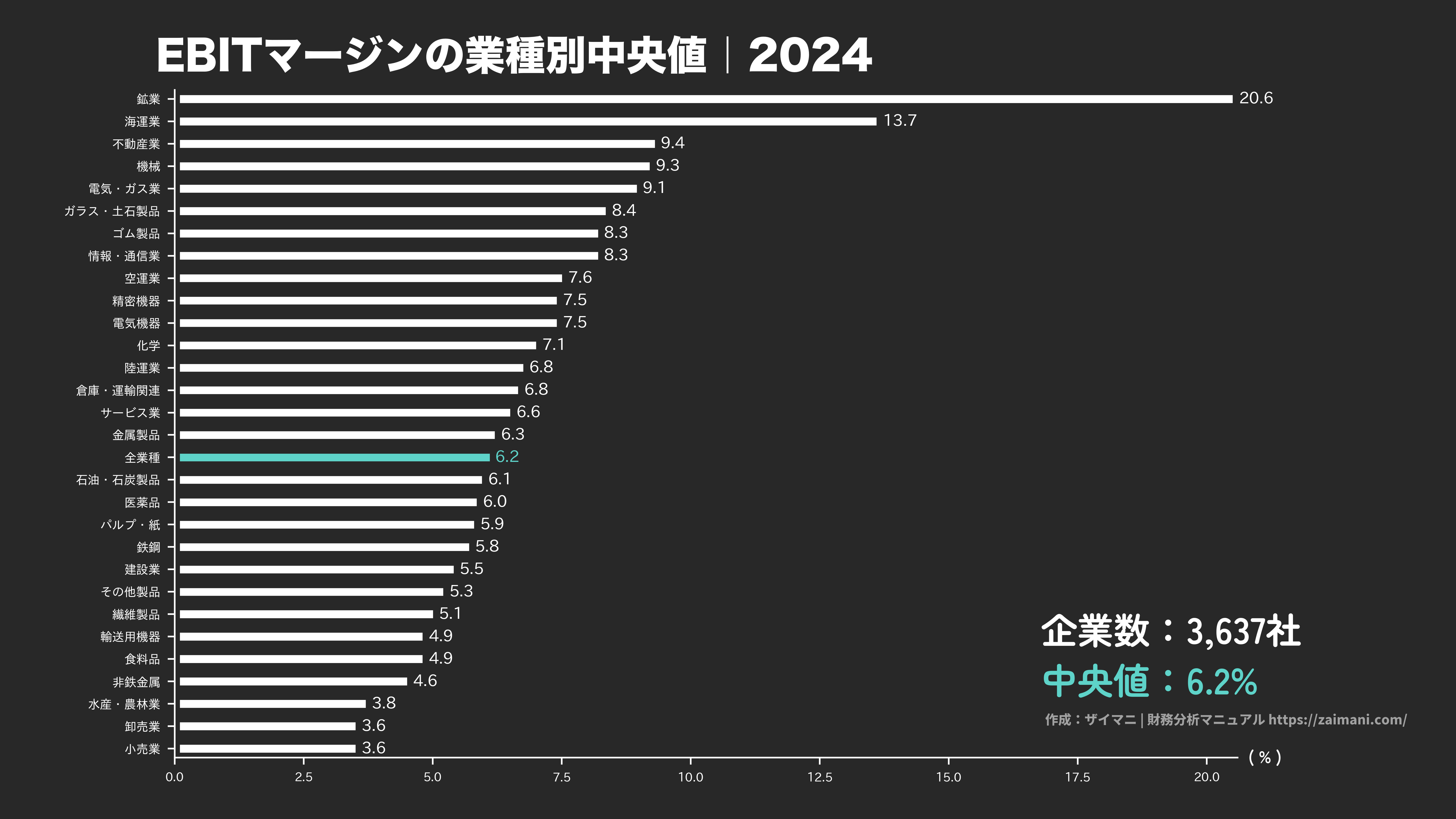 EBITマージンとは、利息と税金の影響を除いた本業の収益力を測定する指標です。計算式は「EBITマージン(%) = EBIT ÷ 売上高」であり、全業種の中央値(目安)は6.2%です。