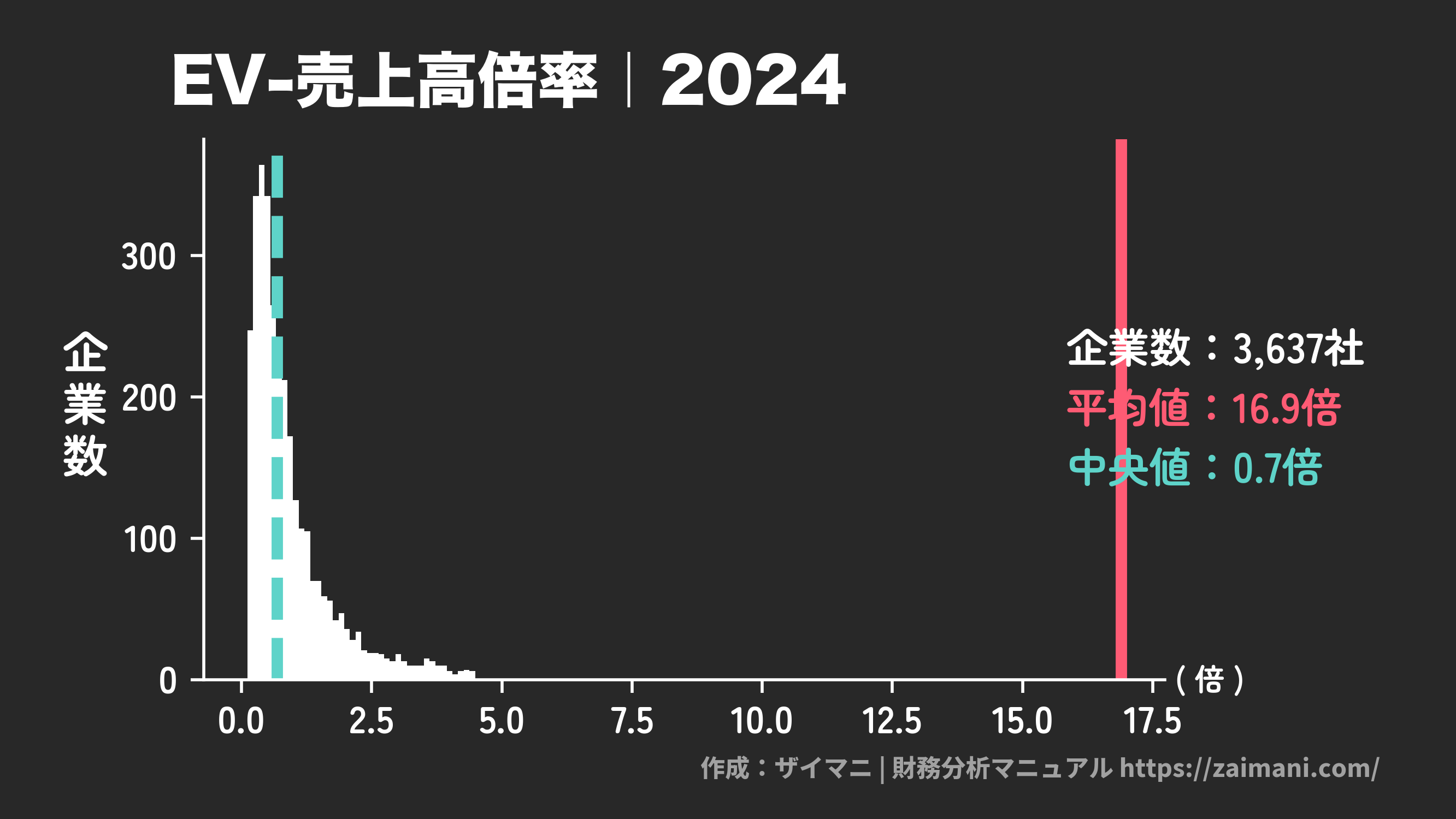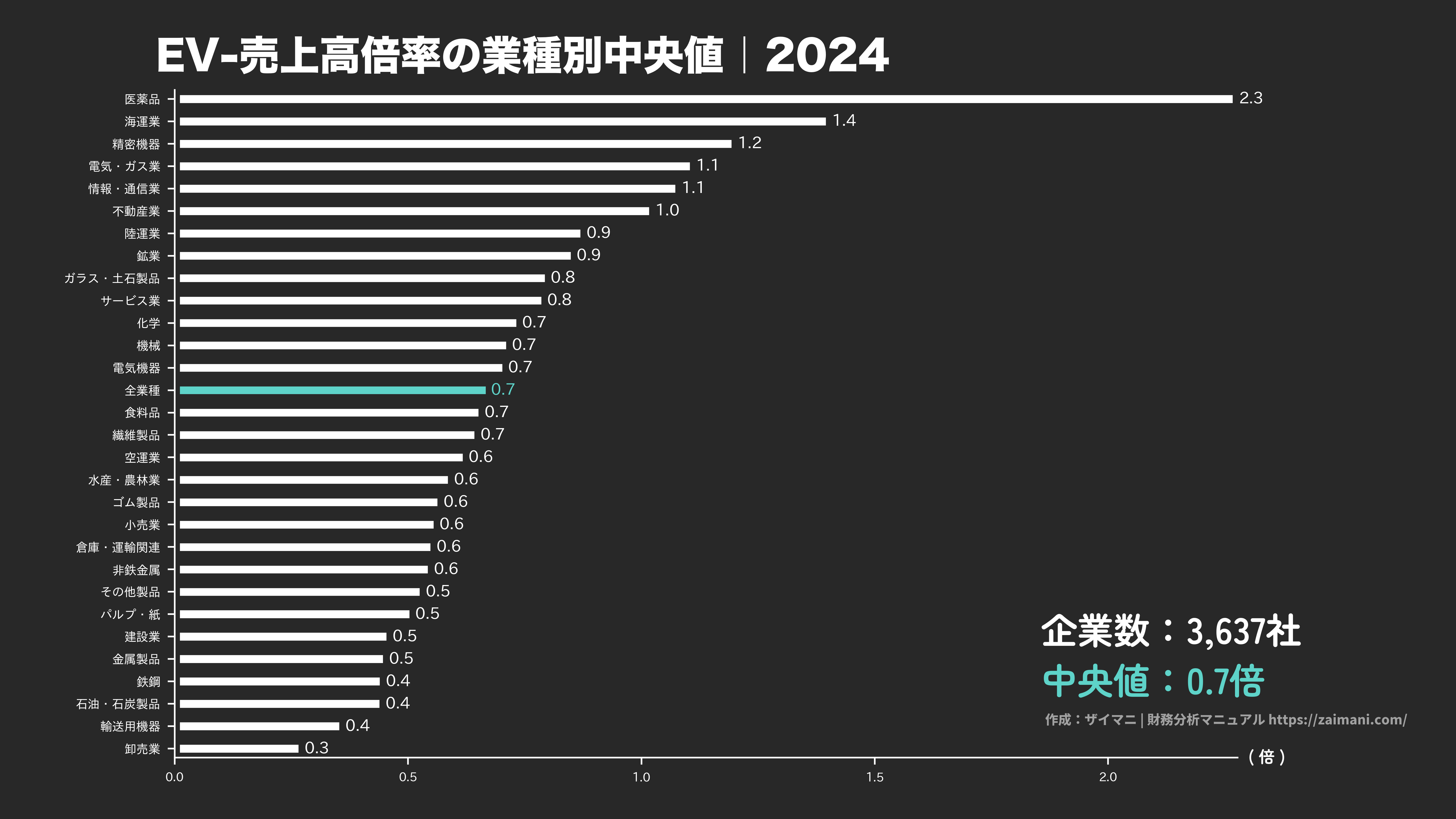 EV/売上高倍率とは、企業価値が売上高の何倍かを測定する指標です。計算式は「EV/売上高倍率(倍) = EV ÷ 売上高」であり、全業種の中央値(目安)は0.7倍です。