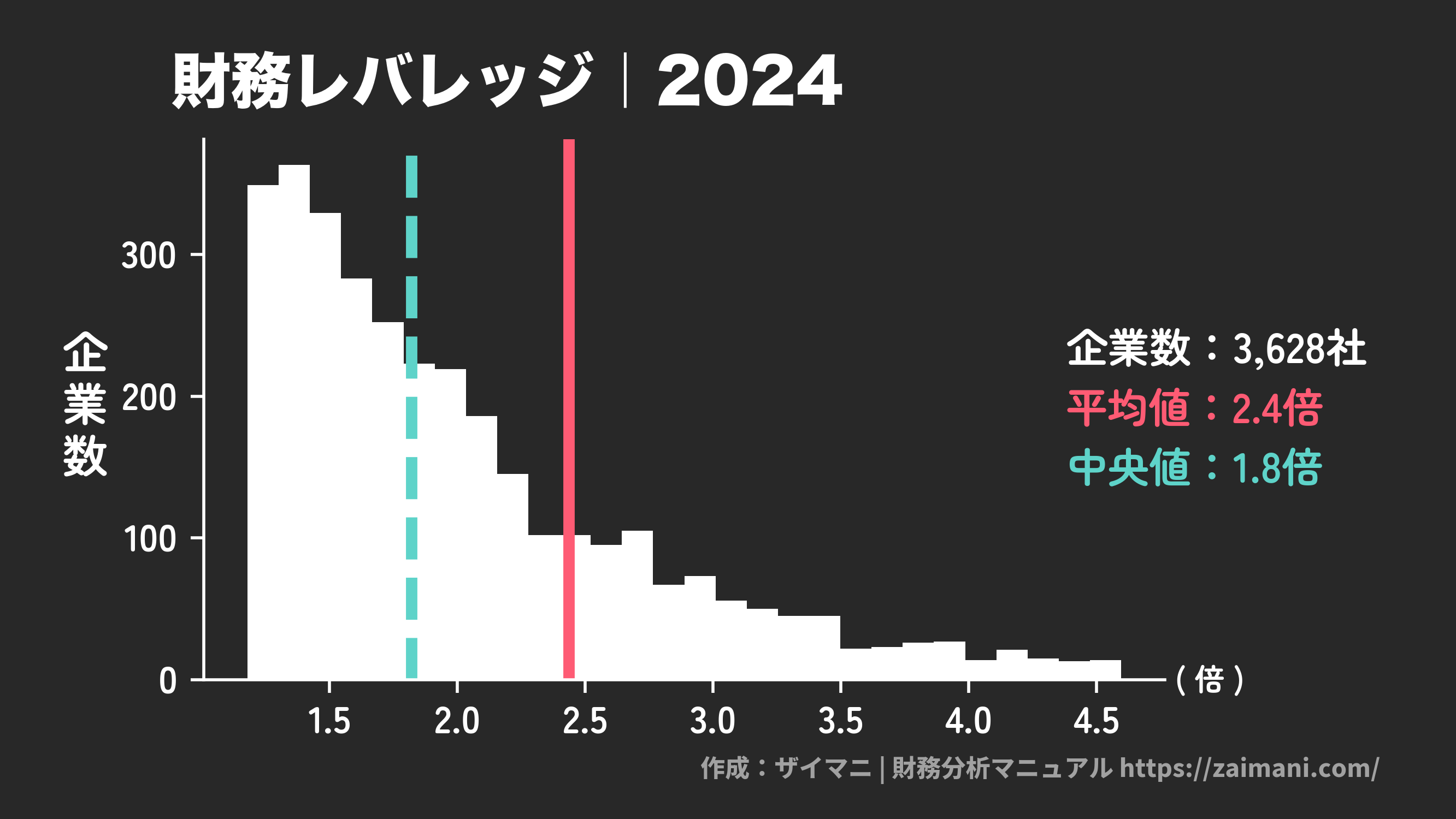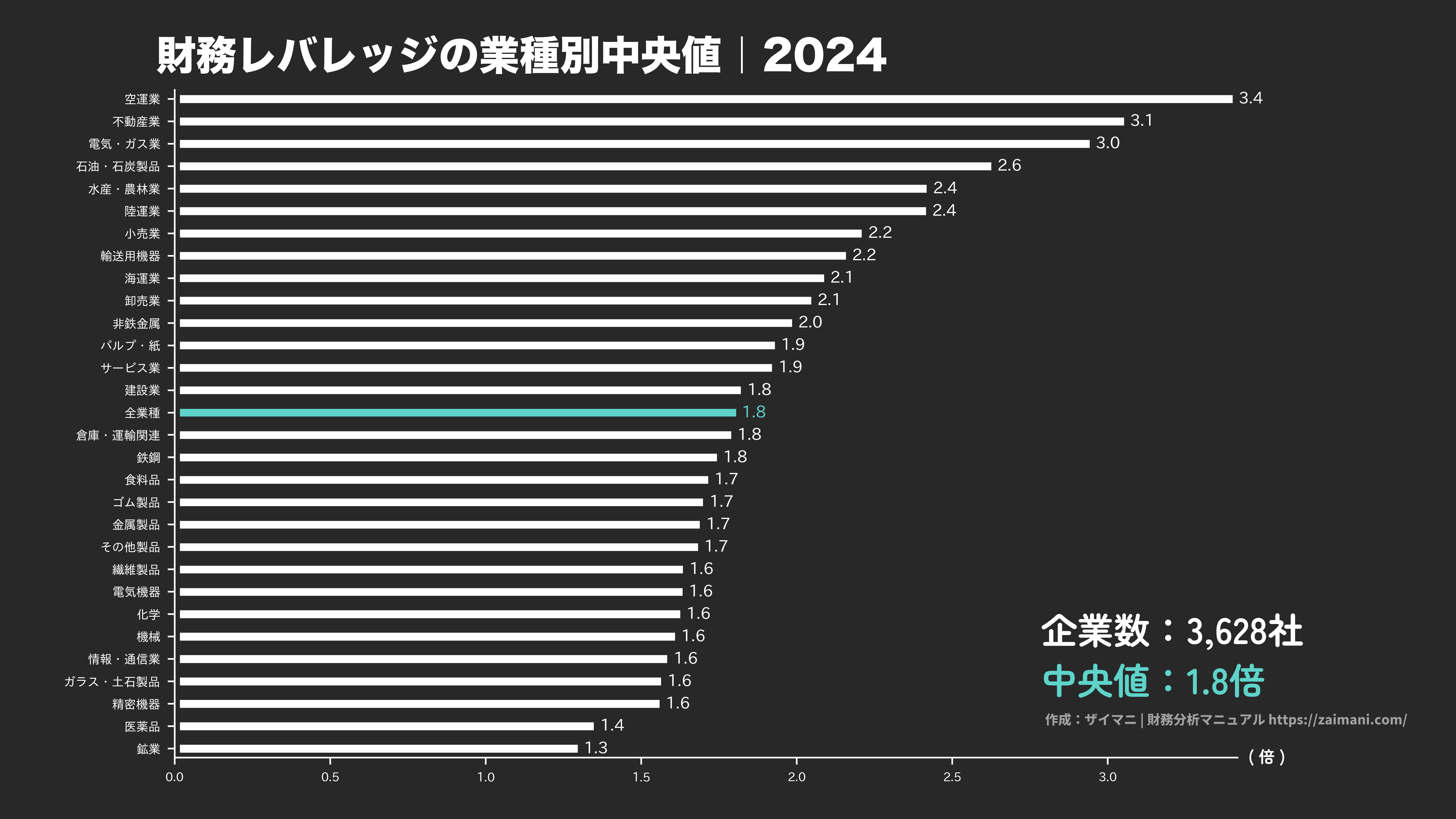 財務レバレッジとは、他人資本を活用して、自己資本の何倍の総資産を調達できているか測定する指標です。計算式は「財務レバレッジ(倍) = 総資産 ÷ 自己資本」であり、全業種の中央値(目安)は1.8倍です。
