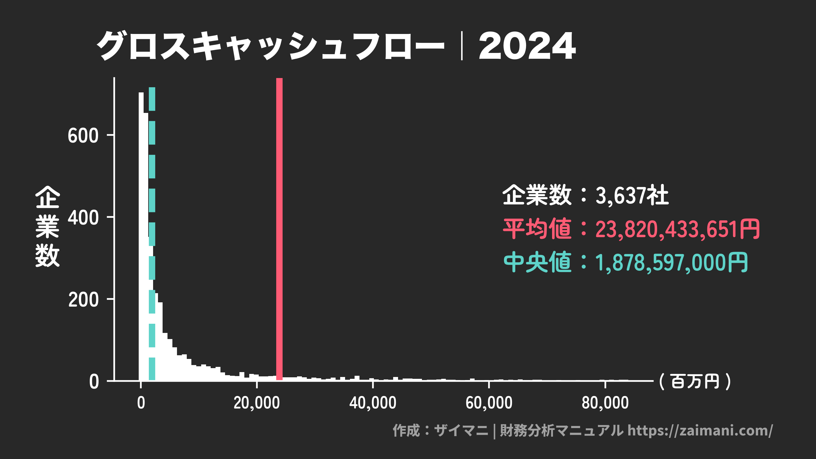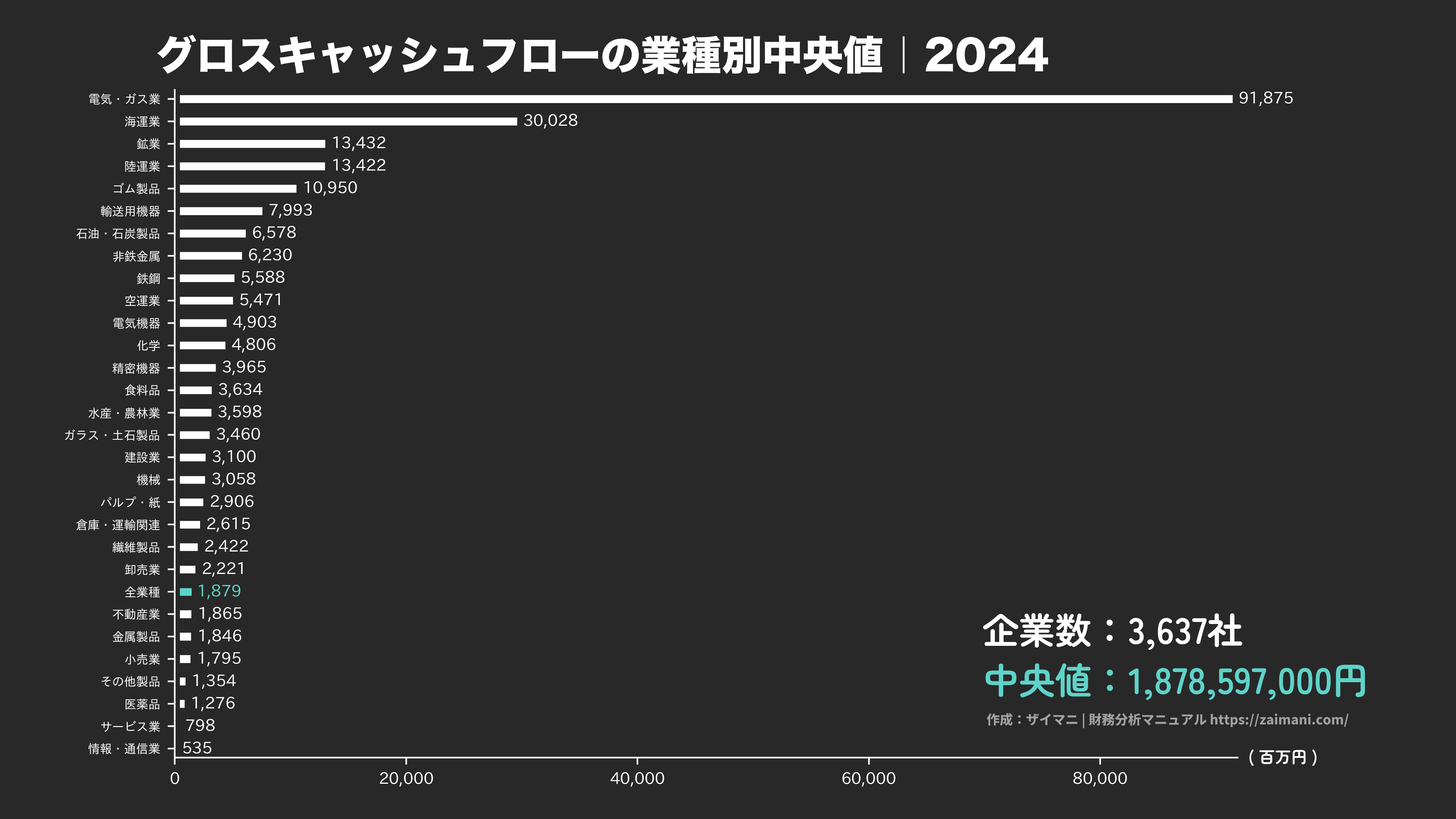 グロスキャッシュフローとは、利益と現金の差分を簡易的に調整した狭義のキャッシュフローです。計算式は「グロスキャッシュフロー(円) = 当期純利益+減価償却費」であり、全業種の中央値(目安)は1,878,597,000円です。
