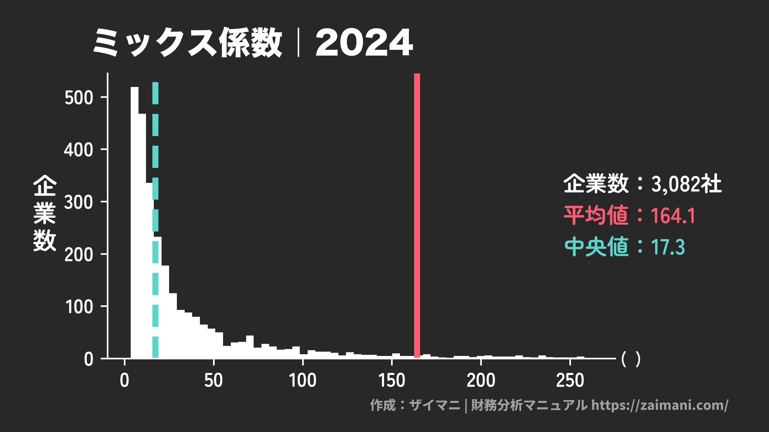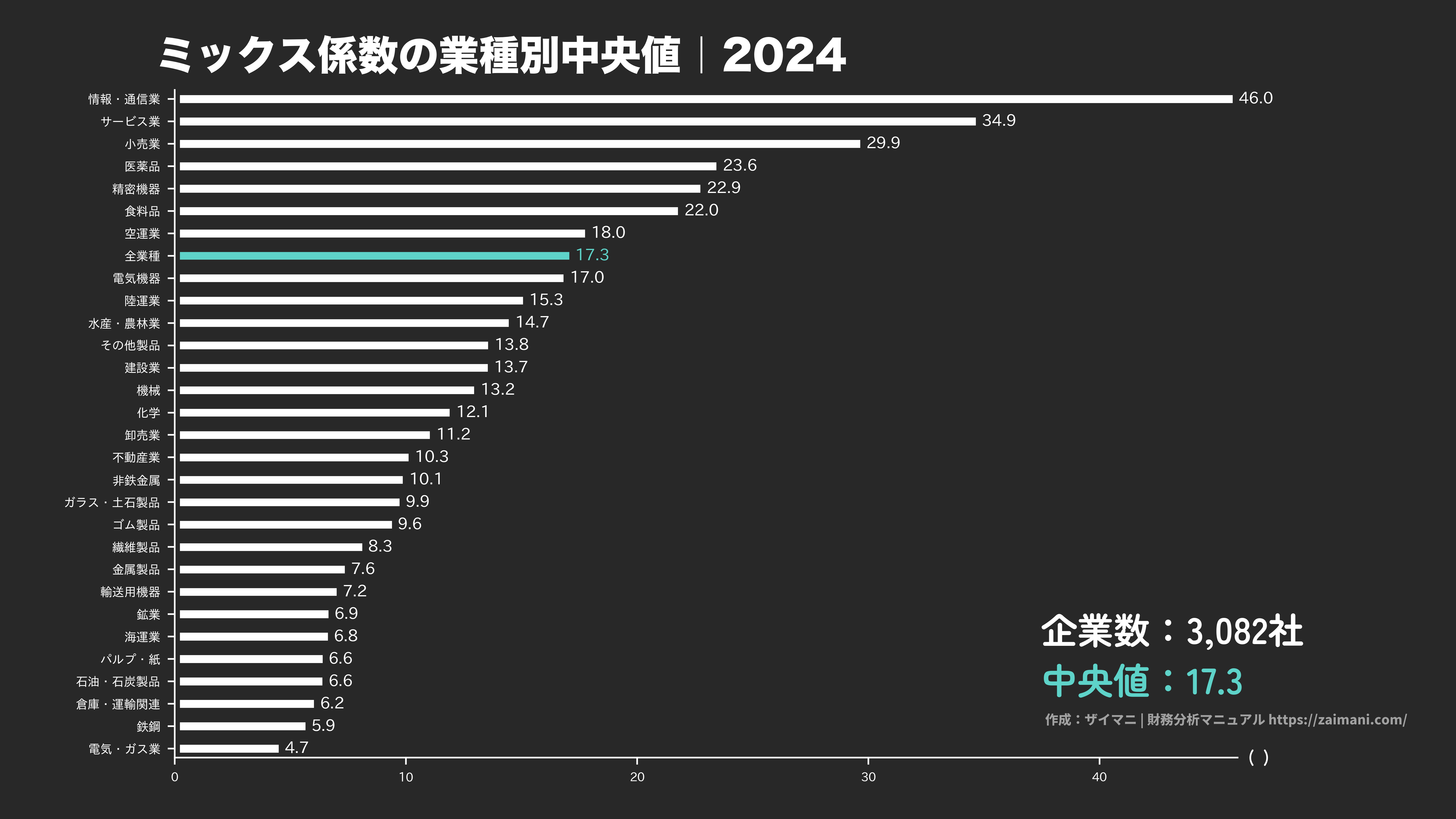 ミックス係数とは、純資産と当期純利益の両方で株価の割安性を測定する 指標です。計算式は「ミックス係数 = PBR × PER 」であり、全業種の中央値(目安)は17.3です。