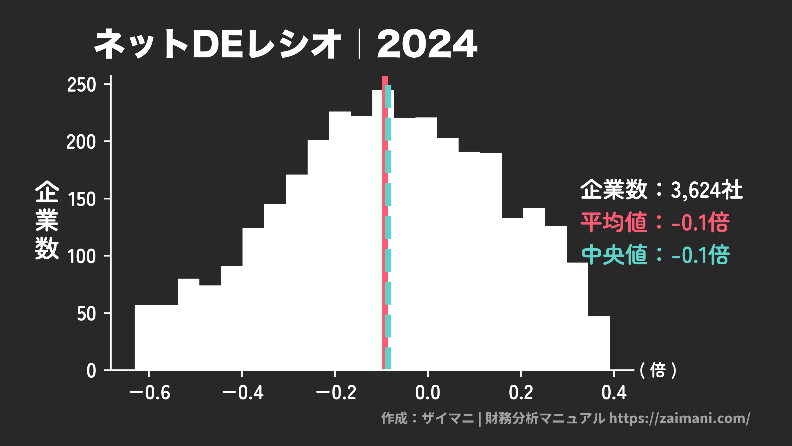 ネットDEレシオとは、DEレシオと比べて、より厳密に有利子負債額の妥当性を測定する指標です。計算式は「ネットDEレシオ(倍) = (有利子負債 – 現金及び預金) ÷ 純資産」であり、全業種の中央値(目安)は-0.1倍です。