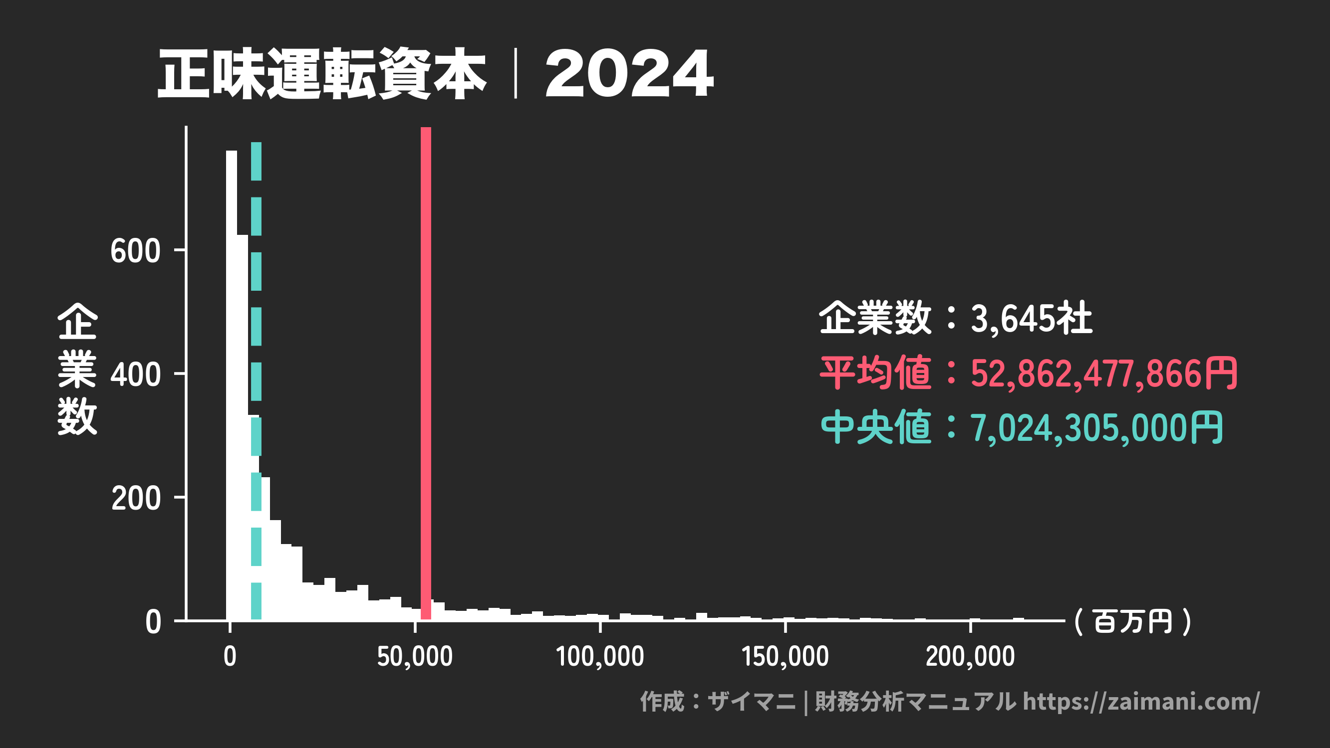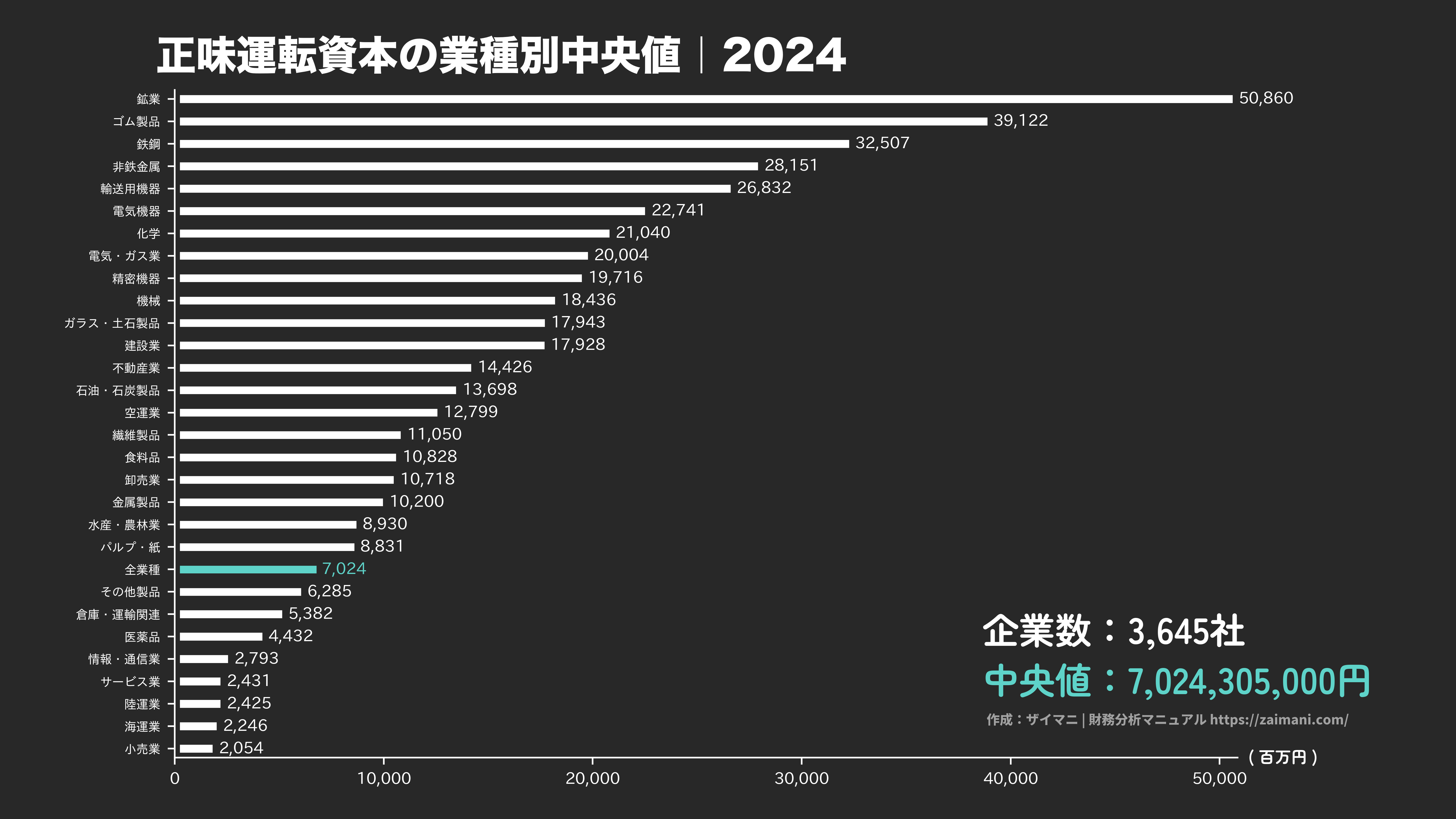 正味運転資本とは、企業の短期的な支払余力を測定する指標です。計算式は「正味運転資本(円) = 流動資産 – 流動負債」であり、全業種の中央値(目安)は7,024,305,000円です。
