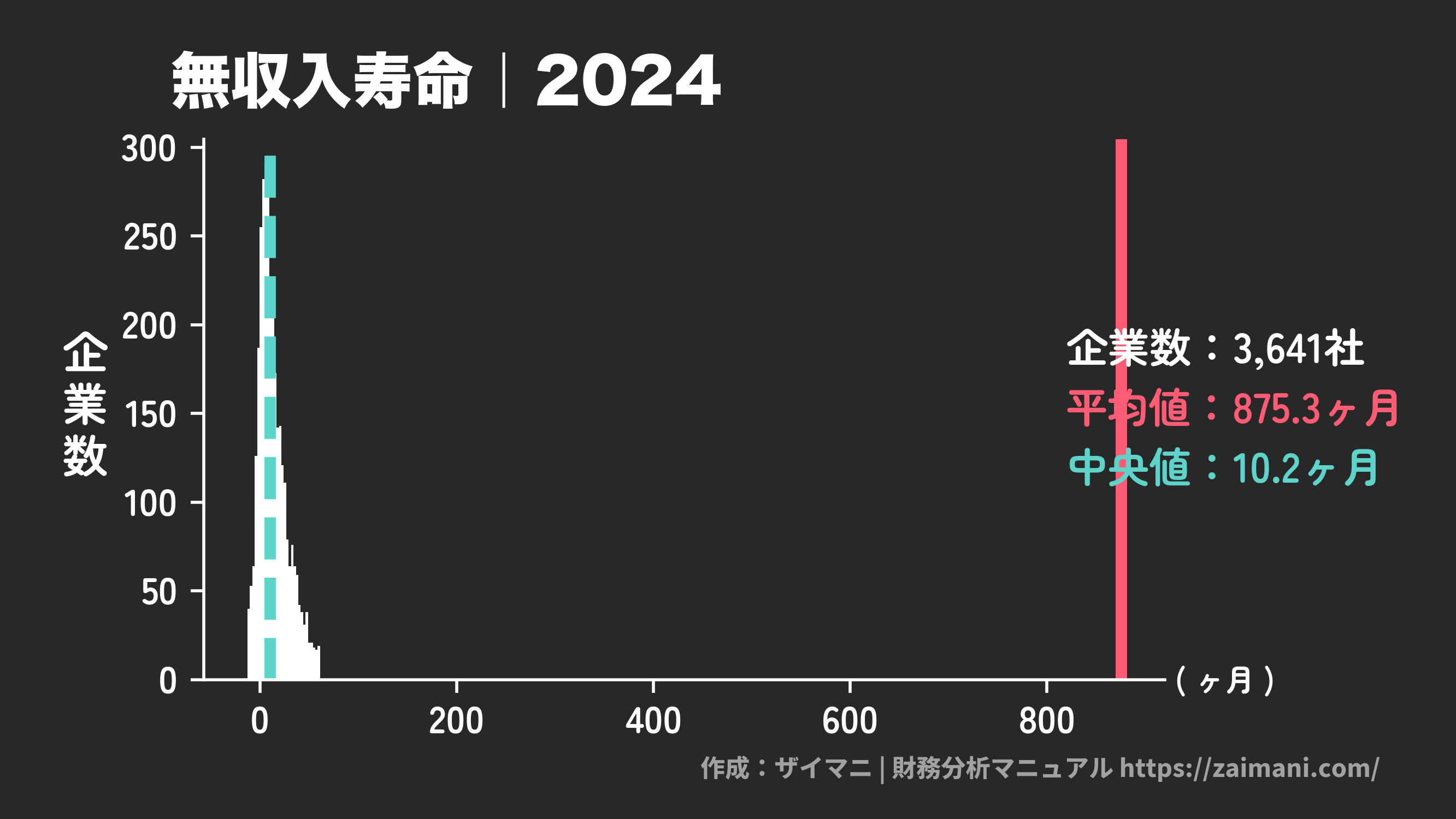 無収入寿命とは、将来的な売上高が0と仮定した場合、純粋な手元資金で何ヶ月間経営の現状維持ができるかを測定する指標です。計算式は「無収入寿命(ヶ月) = 純手元資金 ÷ 一月当たり固定費」であり、全業種の中央値(目安)は10.2ヶ月です。