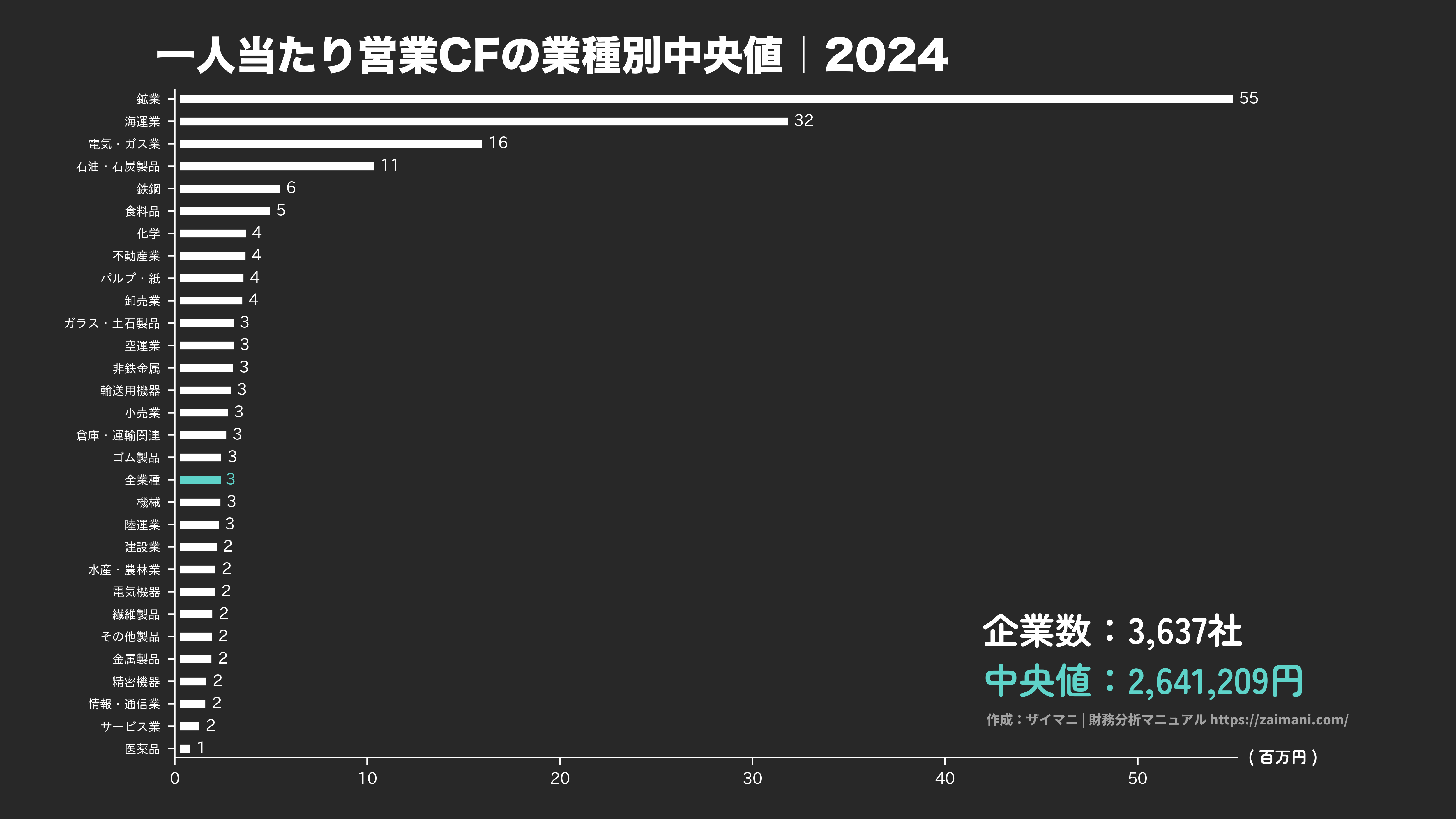 一人当たり営業CFとは、従業員一人当たりの営業CFを測定する指標です。計算式は「一人当たり営業CF(円) = 営業CF ÷ 従業員数」であり、全業種の中央値(目安)は2,641,209円です。
