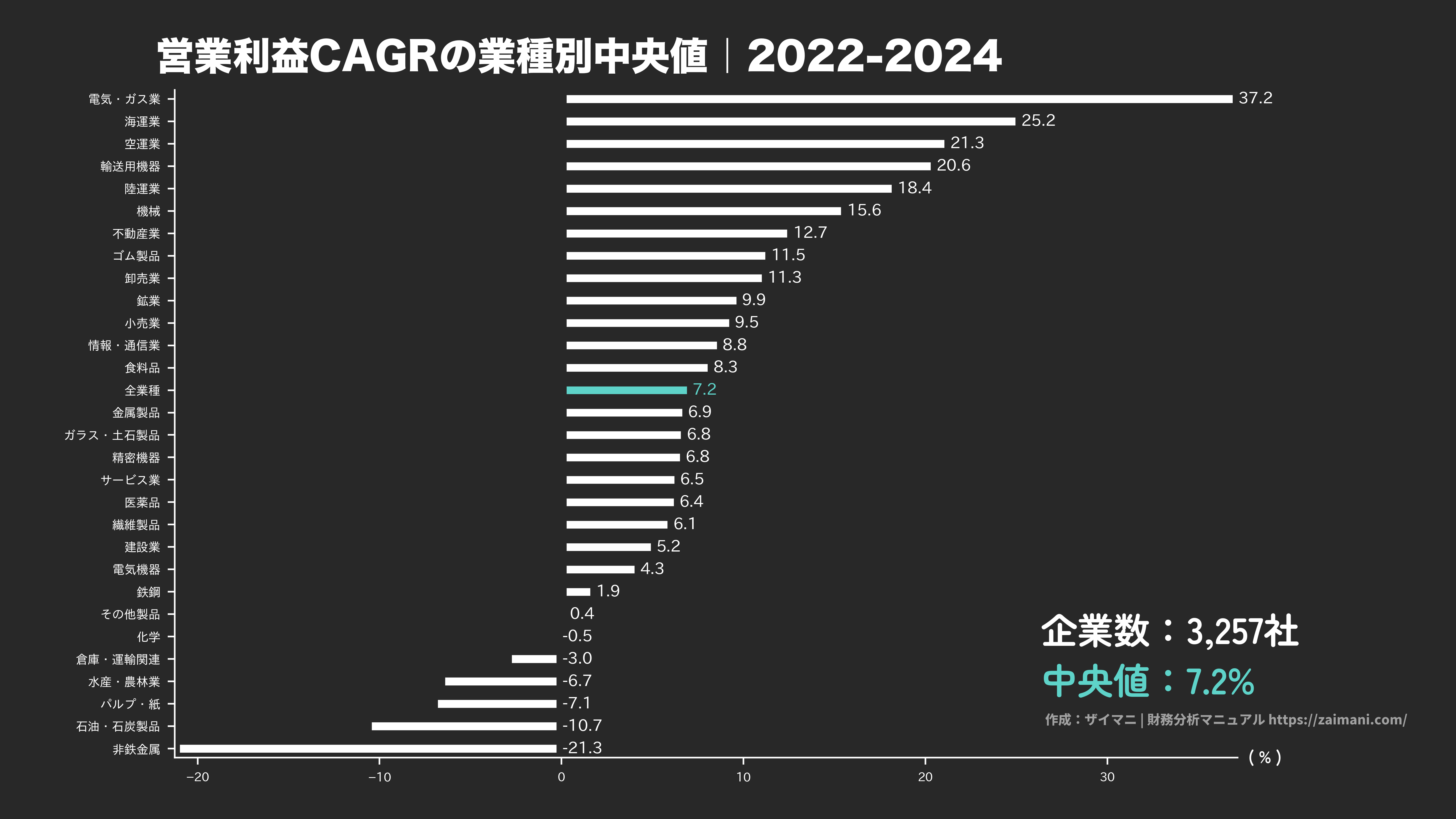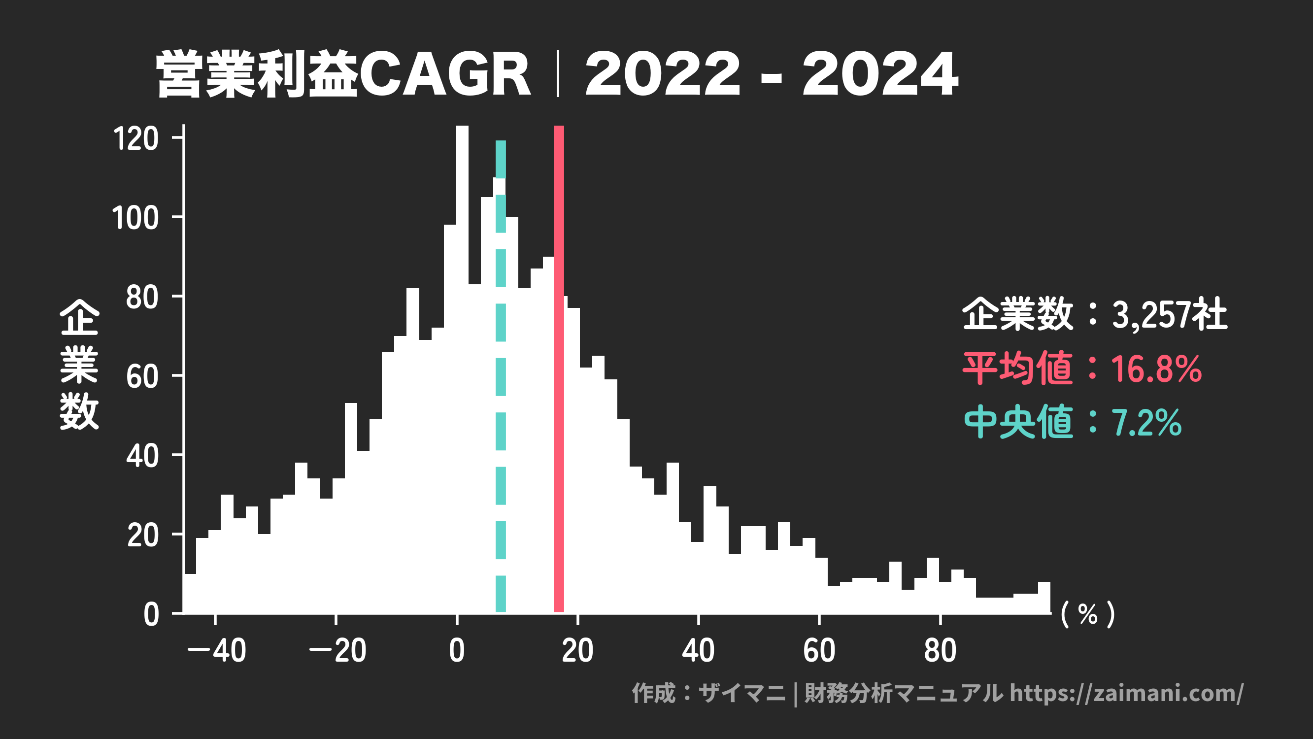 営業利益成長率とは、営業利益が複利を加味して平均的に 何%成長しているかを測定する指標です。計算式は「営業利益成長率(%) = 営業利益のCAGR(年平均成長率)」であり、全業種の中央値(目安)は7.2%です。