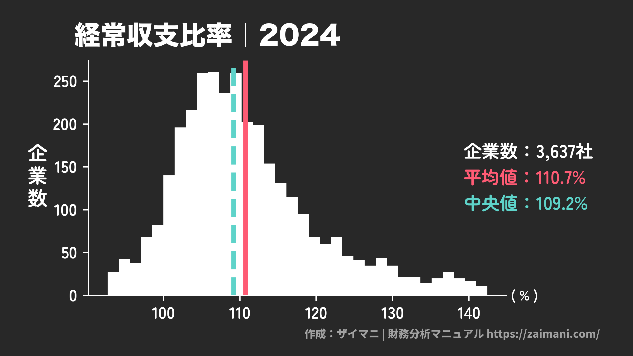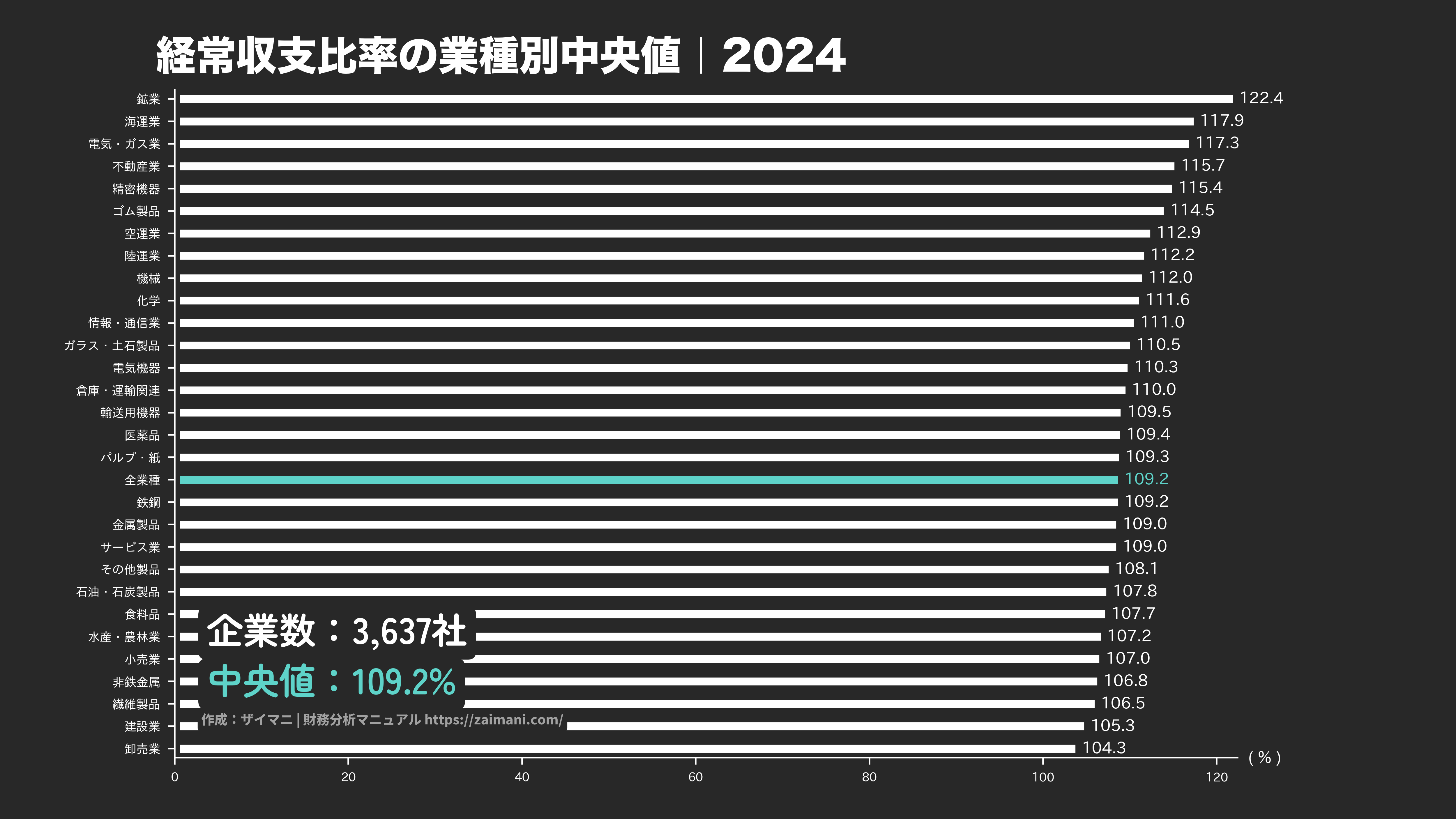 経常収支比率とは、企業の資金繰りの実態を示す指標です。計算式は「経常収支比率(%) = 経常収入 ÷ 経常支出」であり、全業種の中央値(目安)は109.2%です。
