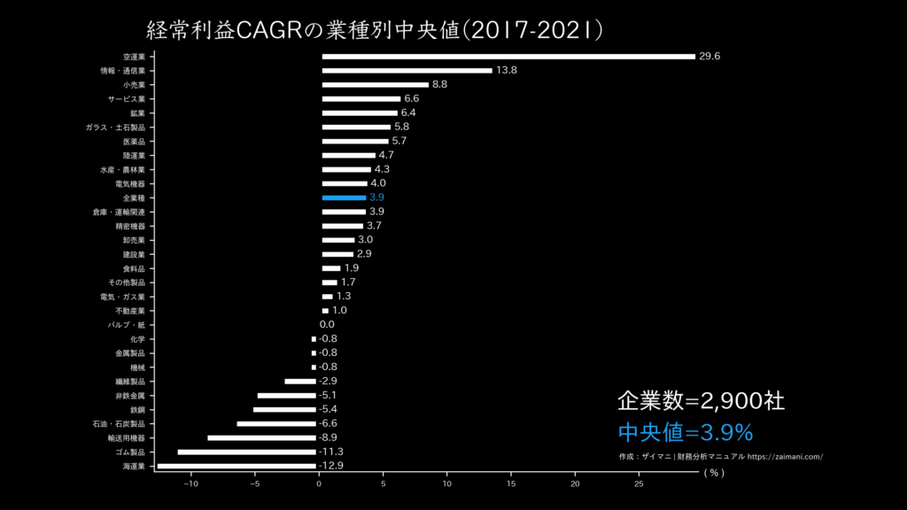 経常利益成長率とは、企業の経常利益が複利を加味して平均的に 何%成長しているかを測定する指標です。計算式は「経常利益成長率(%) = 経常利益のCAGR(年平均成長率)」であり、全業種の中央値(目安)は6.8%です。