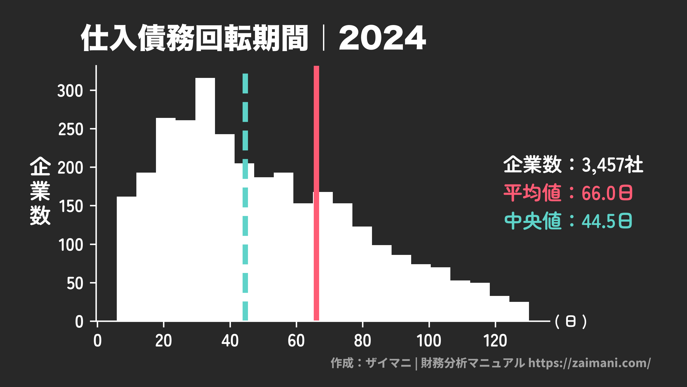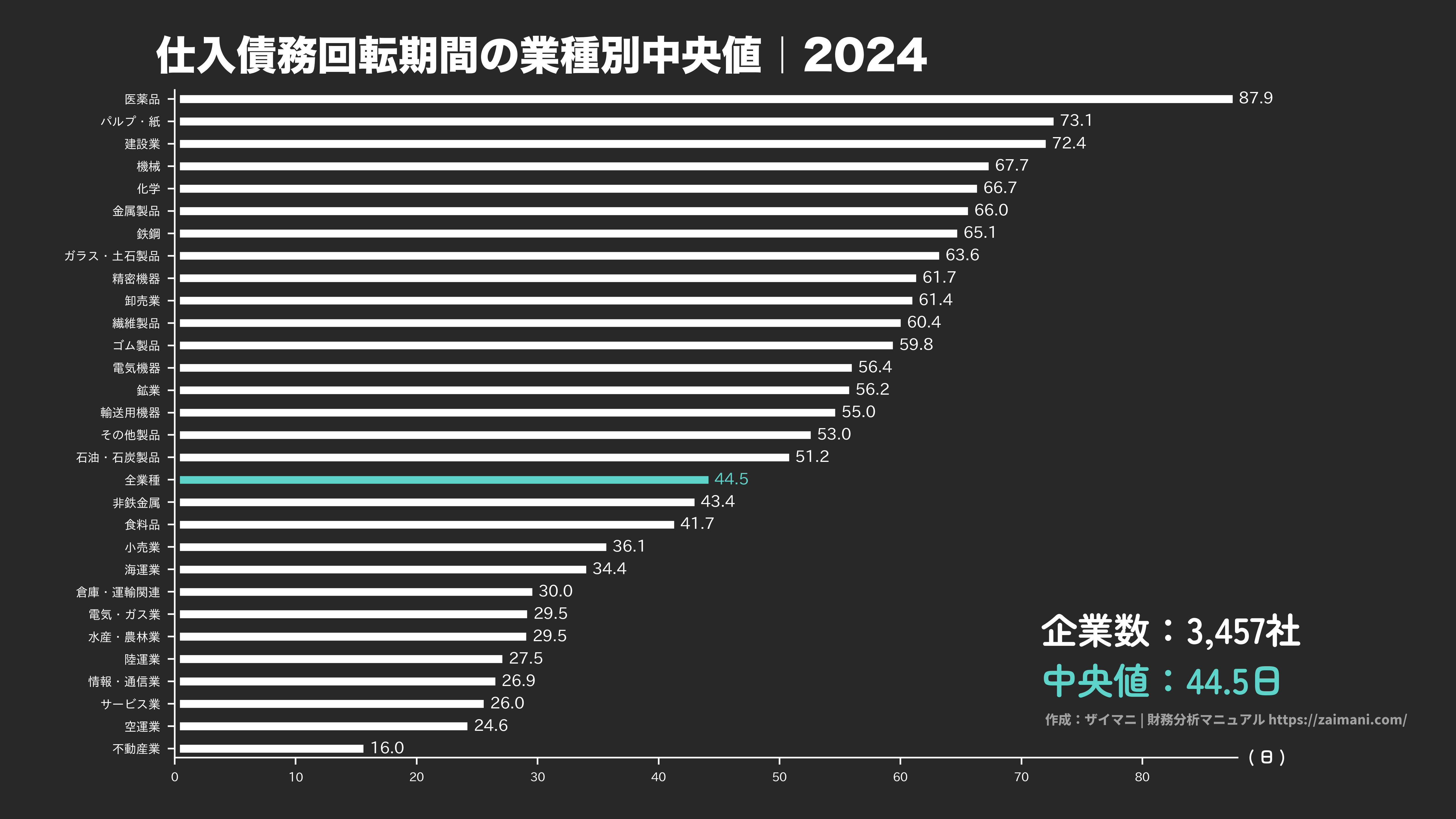 仕入債務回転期間とは、商品の原材料などを購入したのち、仕入先に代金を支払うまでの期間です。計算式は「仕入債務回転期間(日) = 仕入債務 ÷ 1日あたり売上原価」であり、全業種の中央値(目安)は44.5日です。