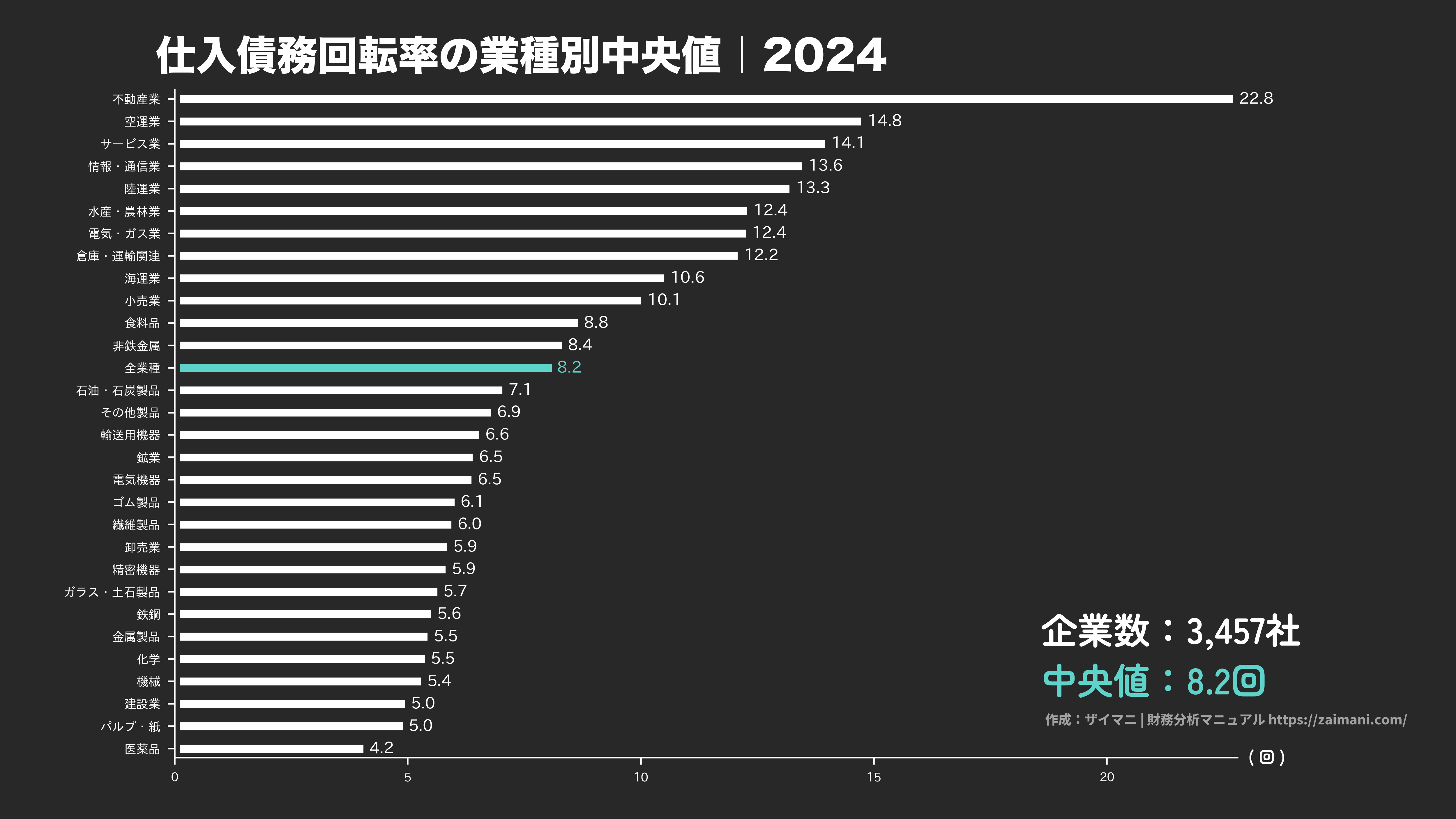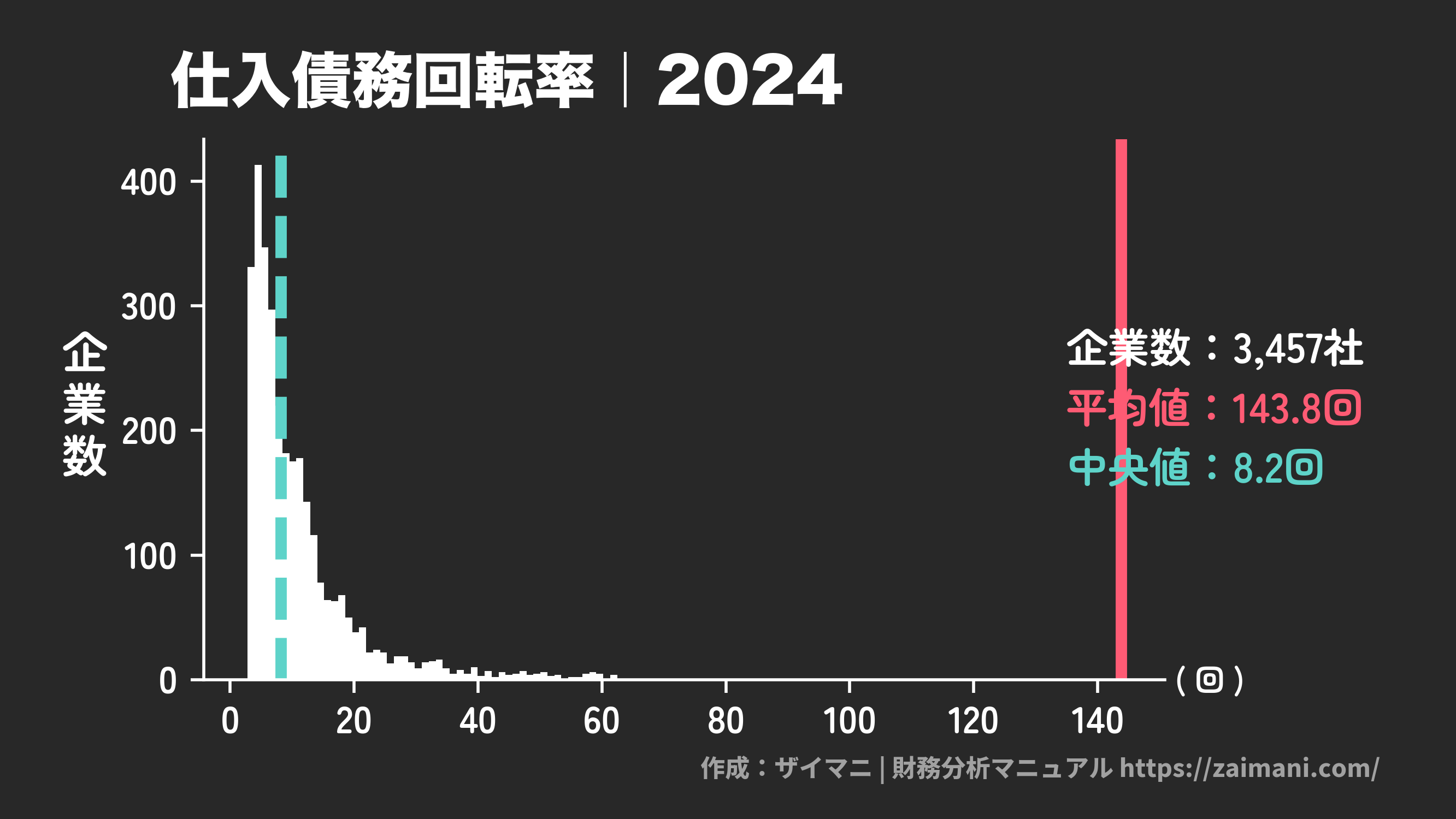 仕入債務回転率とは、仕入債務の支払効率を測定する指標です。計算式は「仕入債務回転率(回) = 売上原価 ÷ 仕入債務」であり、全業種の中央値(目安)は8.2回です。