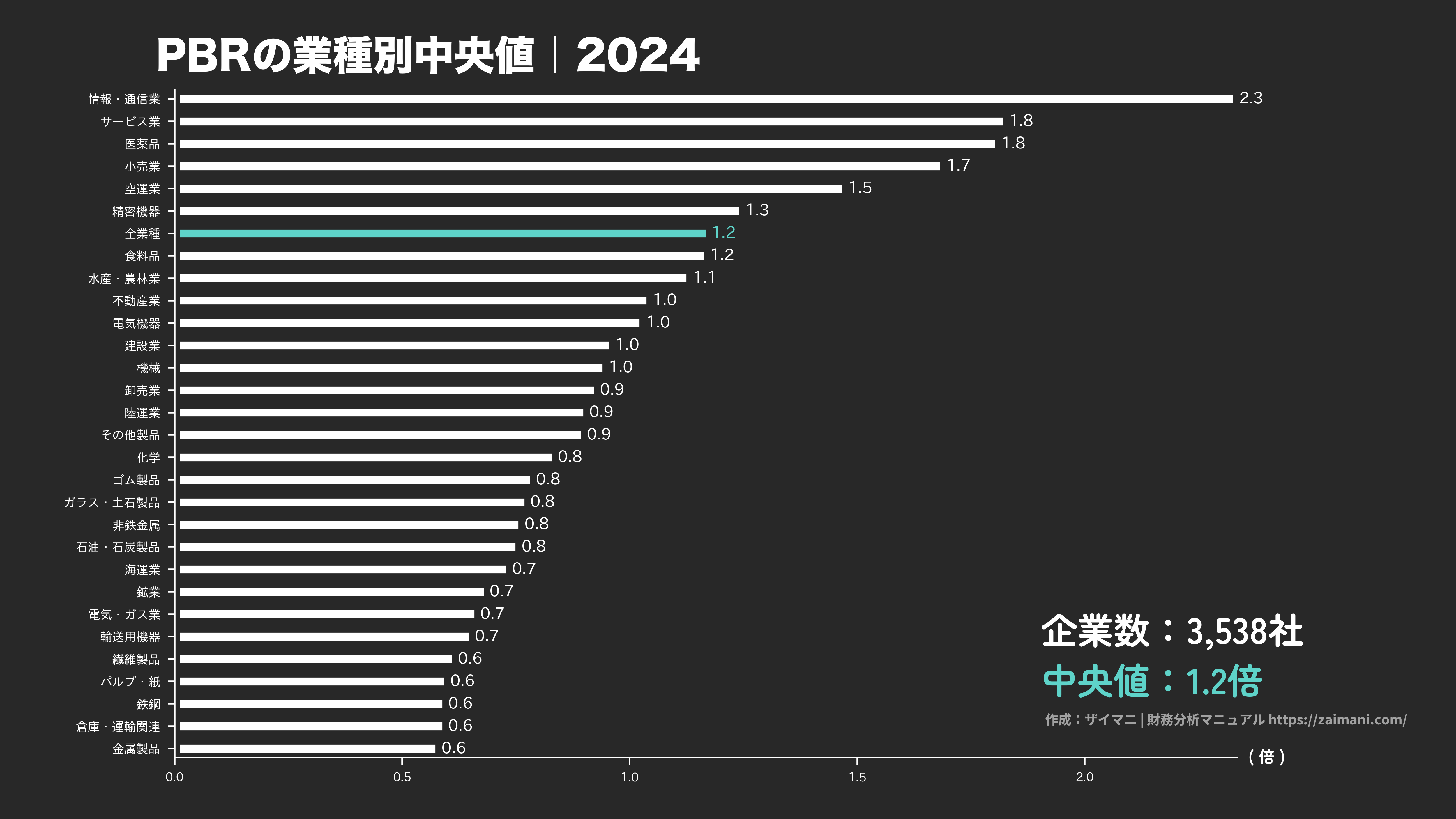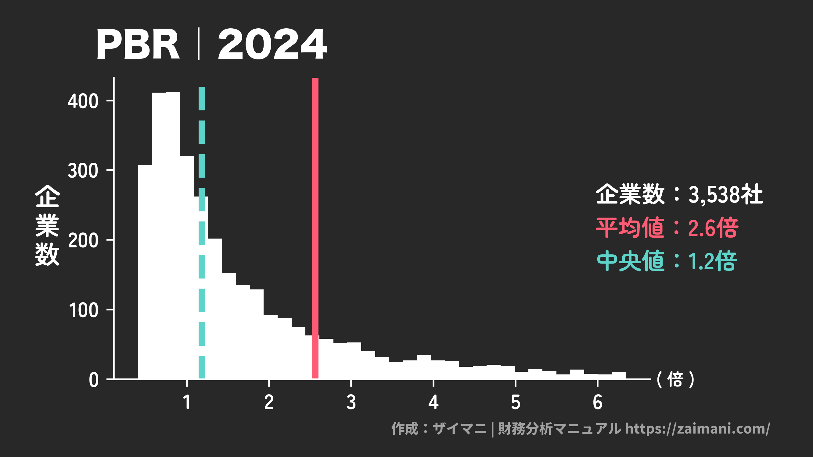 PBRとは、純資産を基準に株価の割安性を測定する指標です。計算式は「PBR(倍) = 時価総額 ÷ 純資産」であり、全業種の中央値(目安)は1.2倍です。
