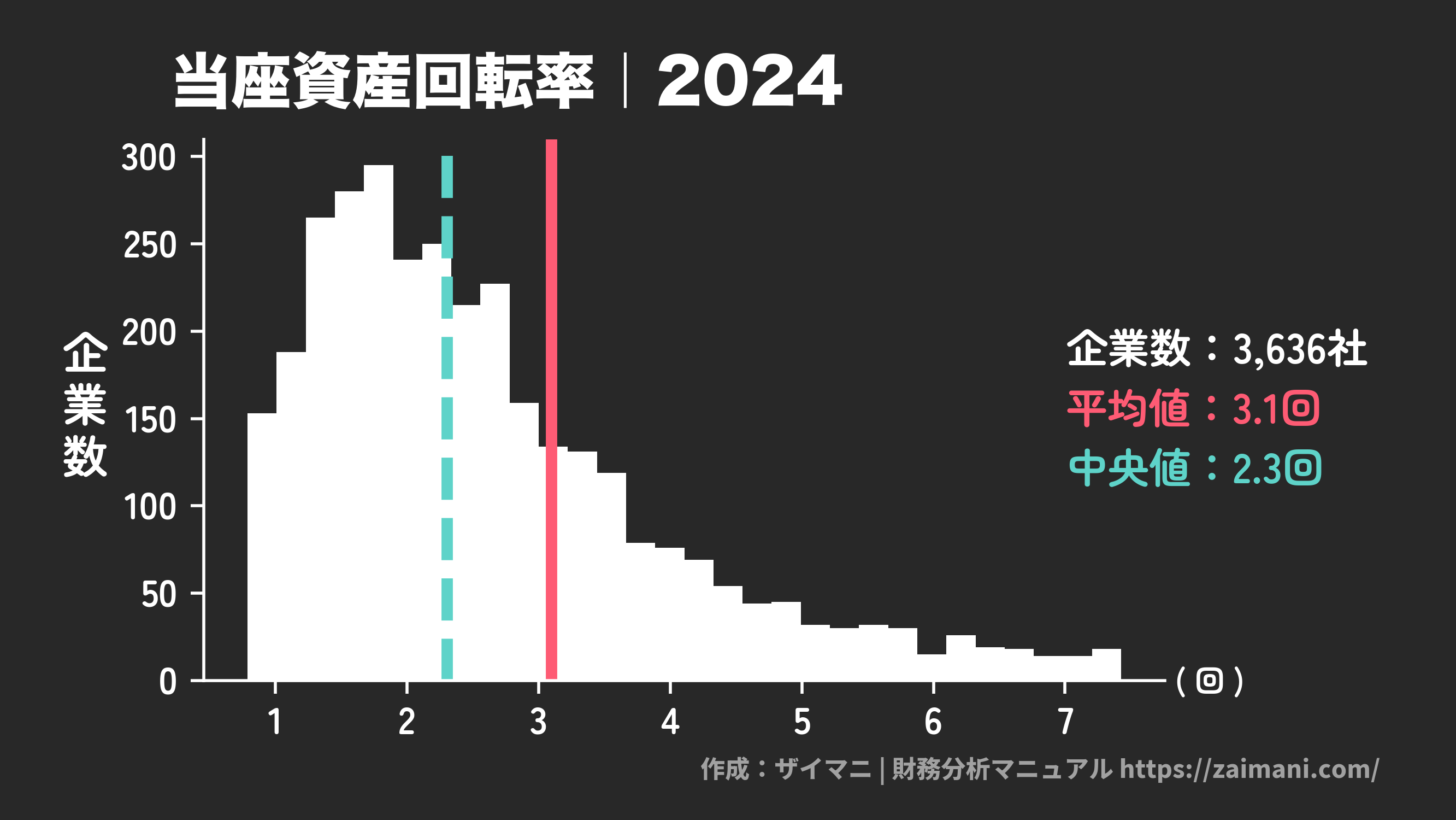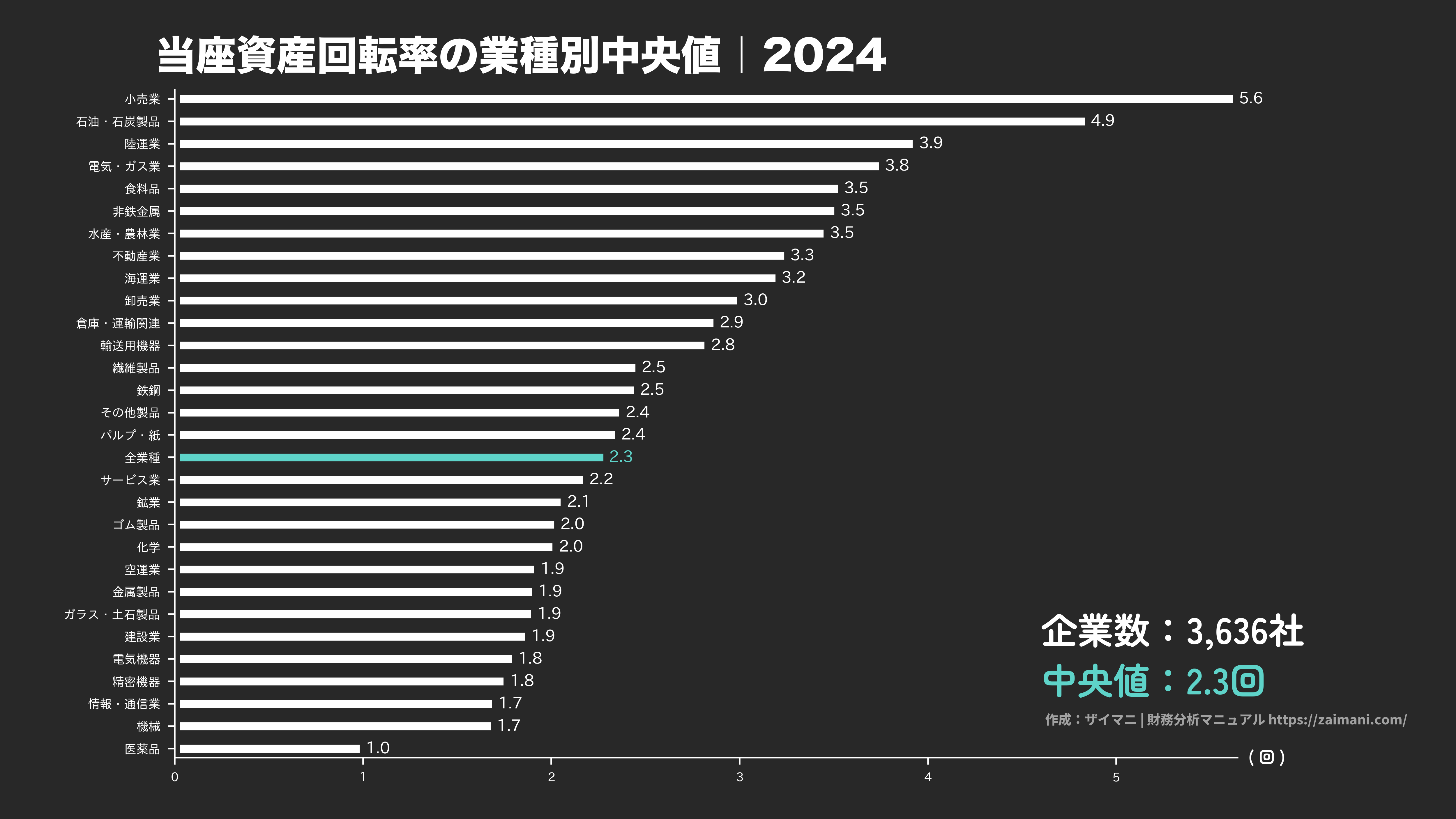 当座資産回転率とは、当座資産残高に対して売上高が何倍かを測定する指標です。計算式は「当座資産回転率(回) = 売上高 ÷ 当座資産」であり、全業種の中央値(目安)は2.3回です。