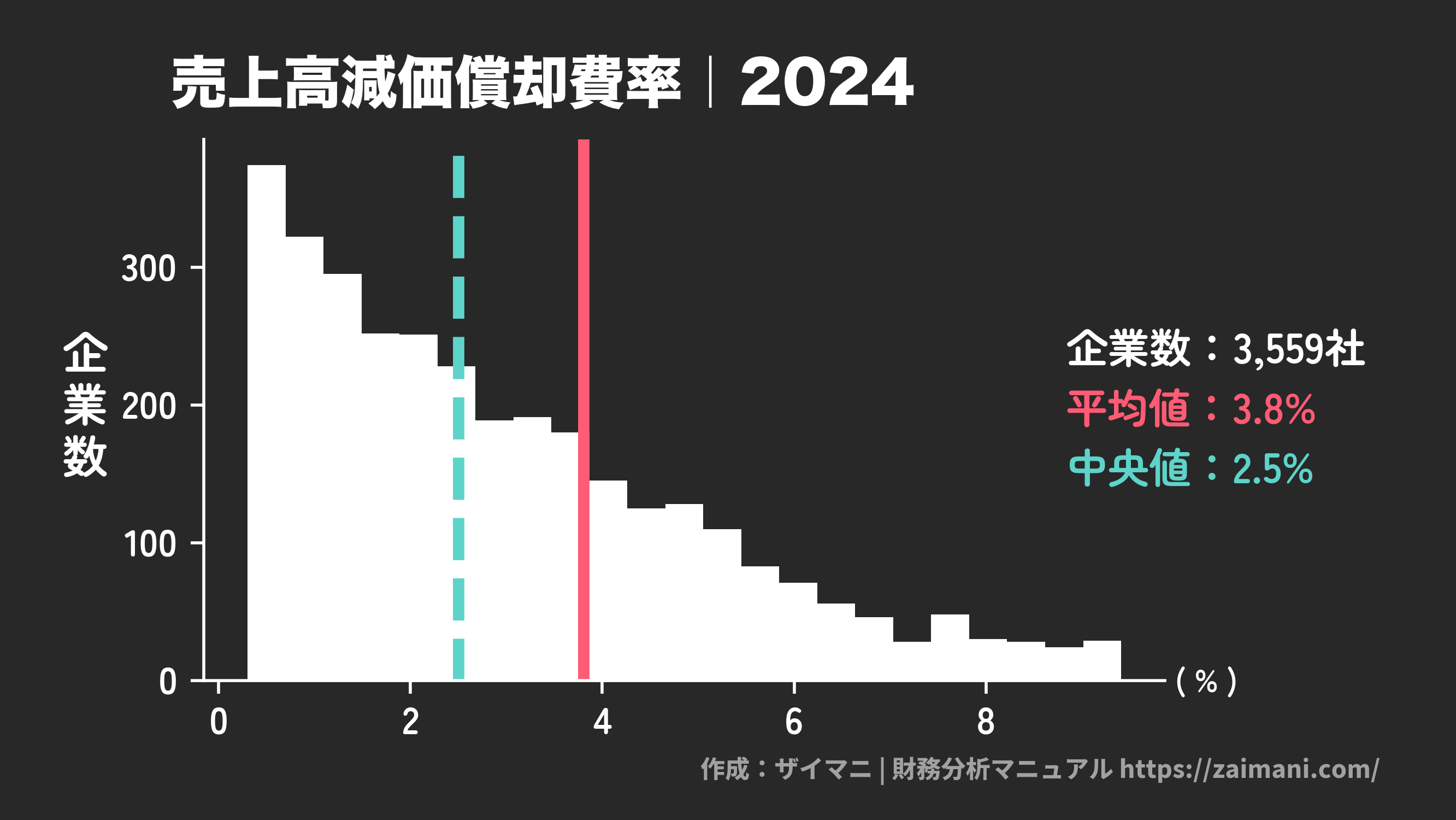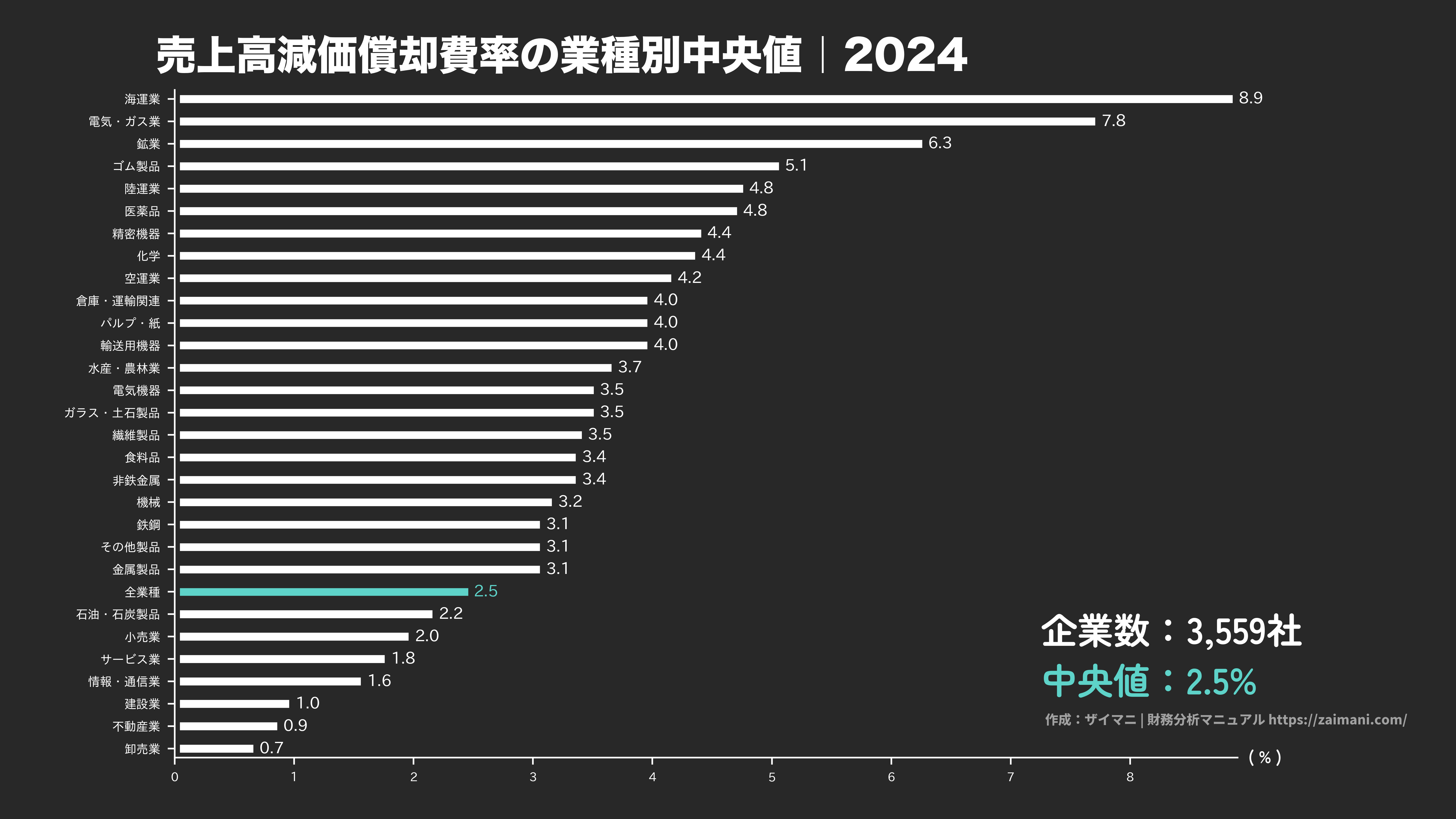 売上高減価償却費率とは、売上高に占める減価償却費の割合を測定する指標です。計算式は「売上高減価償却費率(%) = 減価償却費 ÷ 売上高」であり、全業種の中央値(目安)は2.5%です。