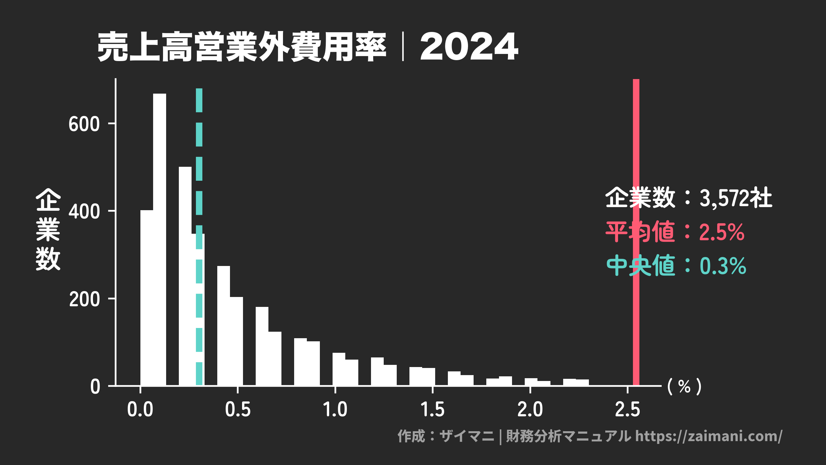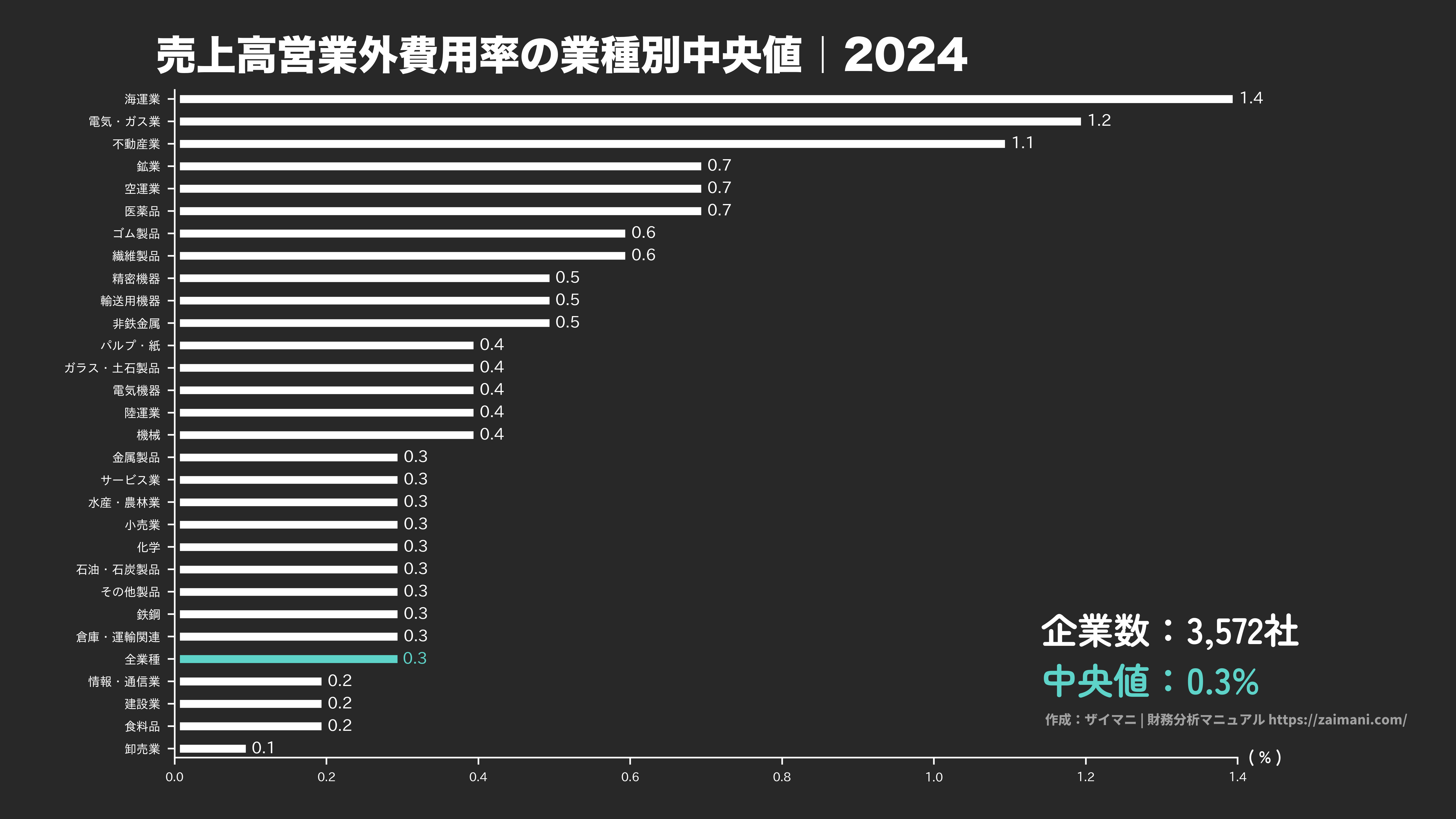 売上高営業外費用率とは、事業規模に占める財務費用の割合を測定する指標です。計算式は「売上高営業外費用率(%) = 営業外費用 ÷ 売上高」であり、全業種の中央値(目安)は0.3%です。