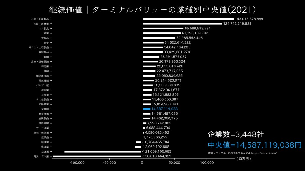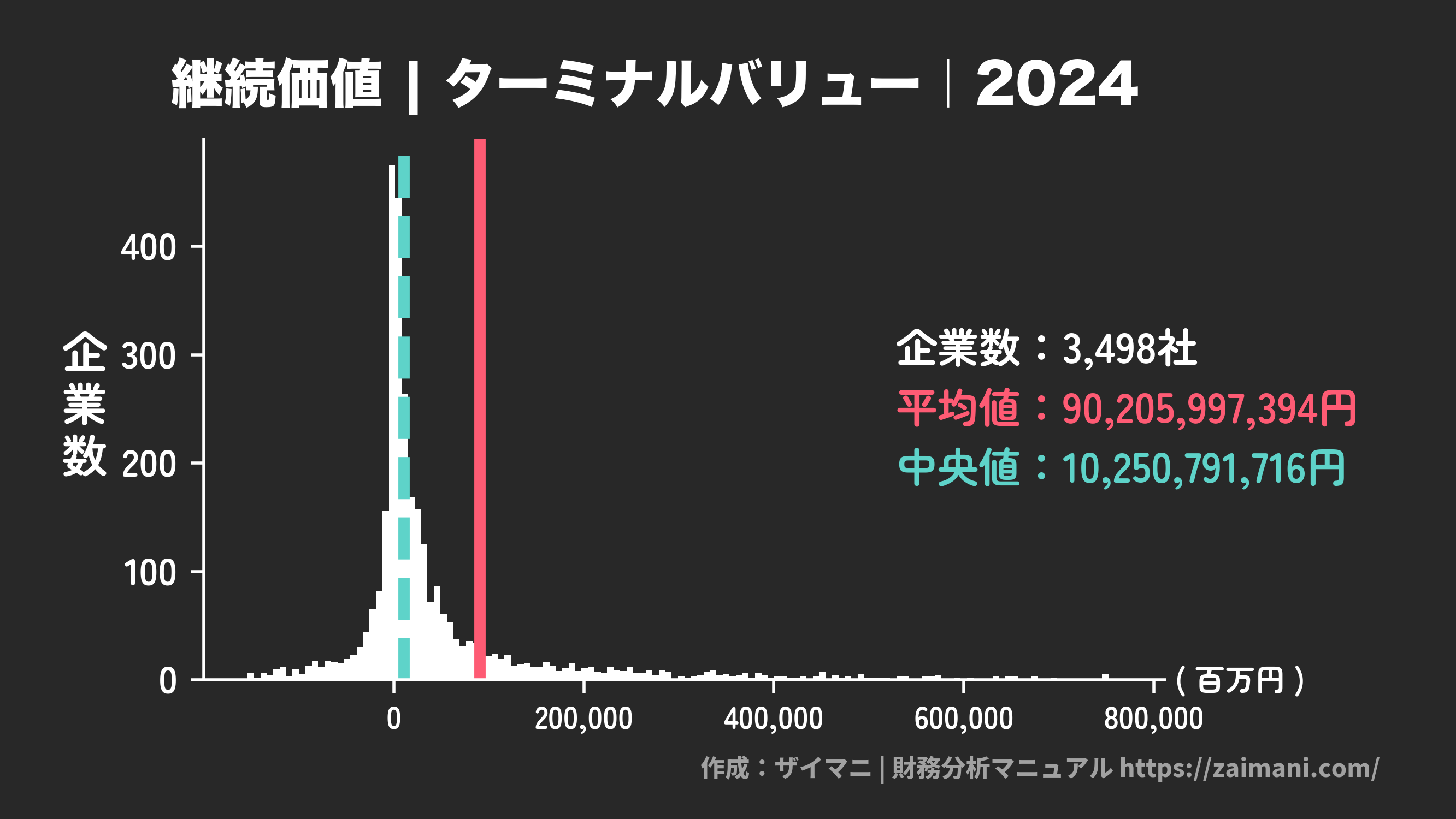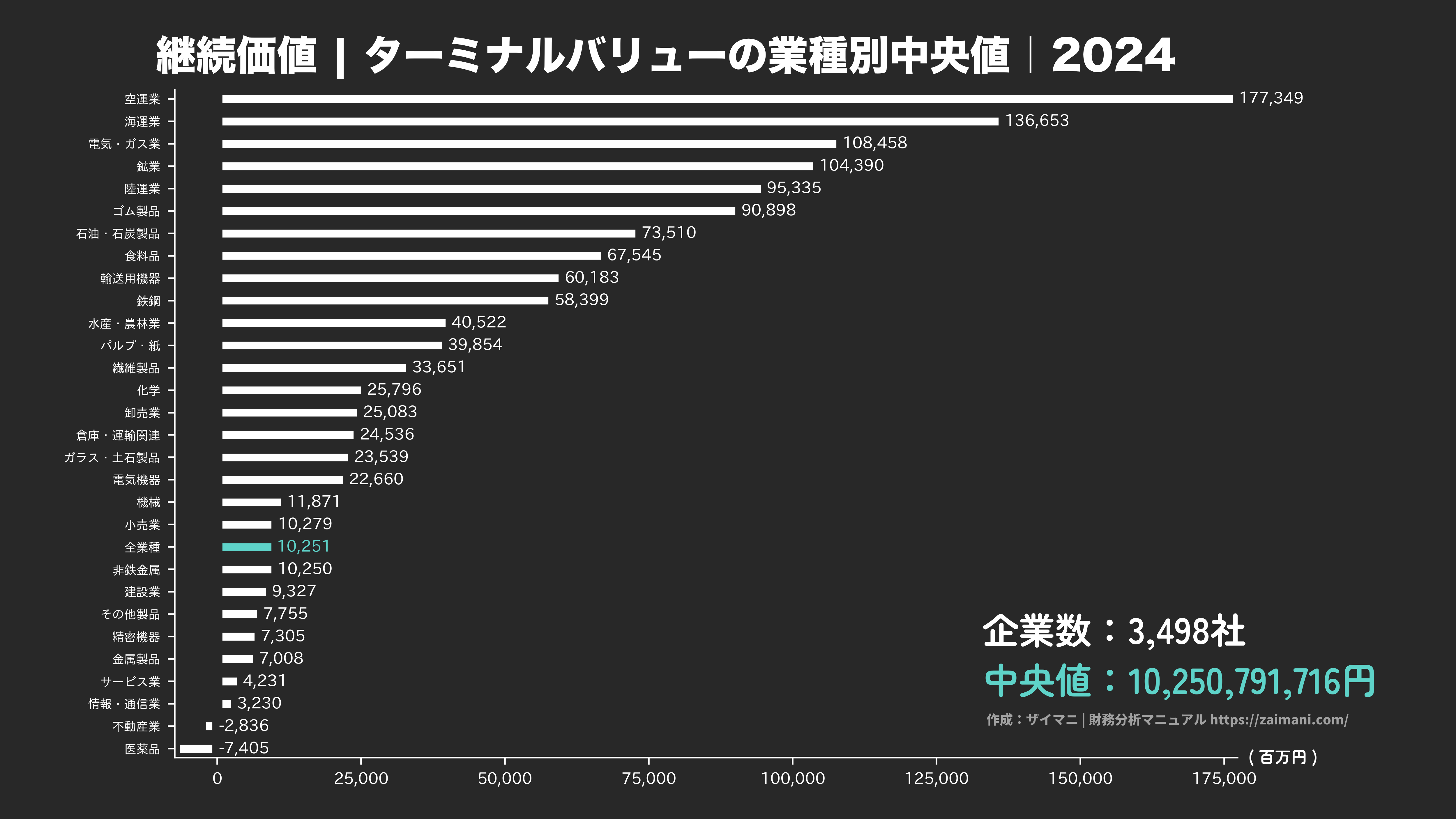 継続価値とは、「将来的に生み出す年間FCFが変化しない」と仮定した場合において、事業計画(ある程度正確にFCFが予測できる期間)以後の企業価値です。計算式は「継続価値(円) = FCF ÷ WACC」であり、全業種の中央値(目安)は10,250,791,716円です。