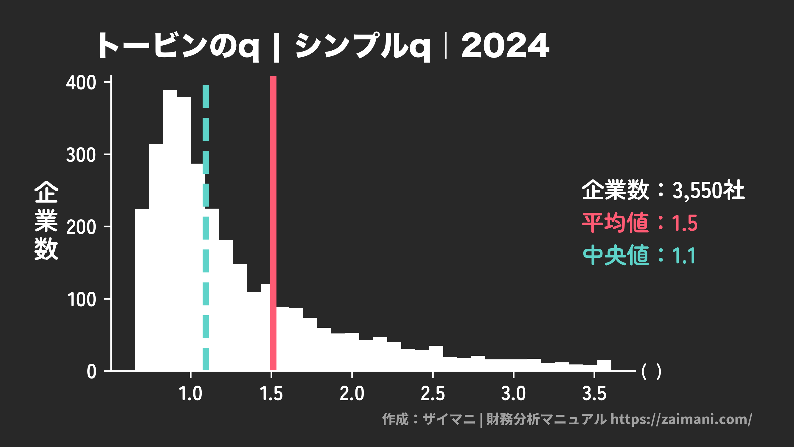 トービンのqとは、企業の総価値が総資産の再取得価格を上回るかを測定する指標です。計算式は「トービンのq = (時価総額 + 有利子負債) ÷ 総資産」であり、全業種の中央値(目安)は1.1です。