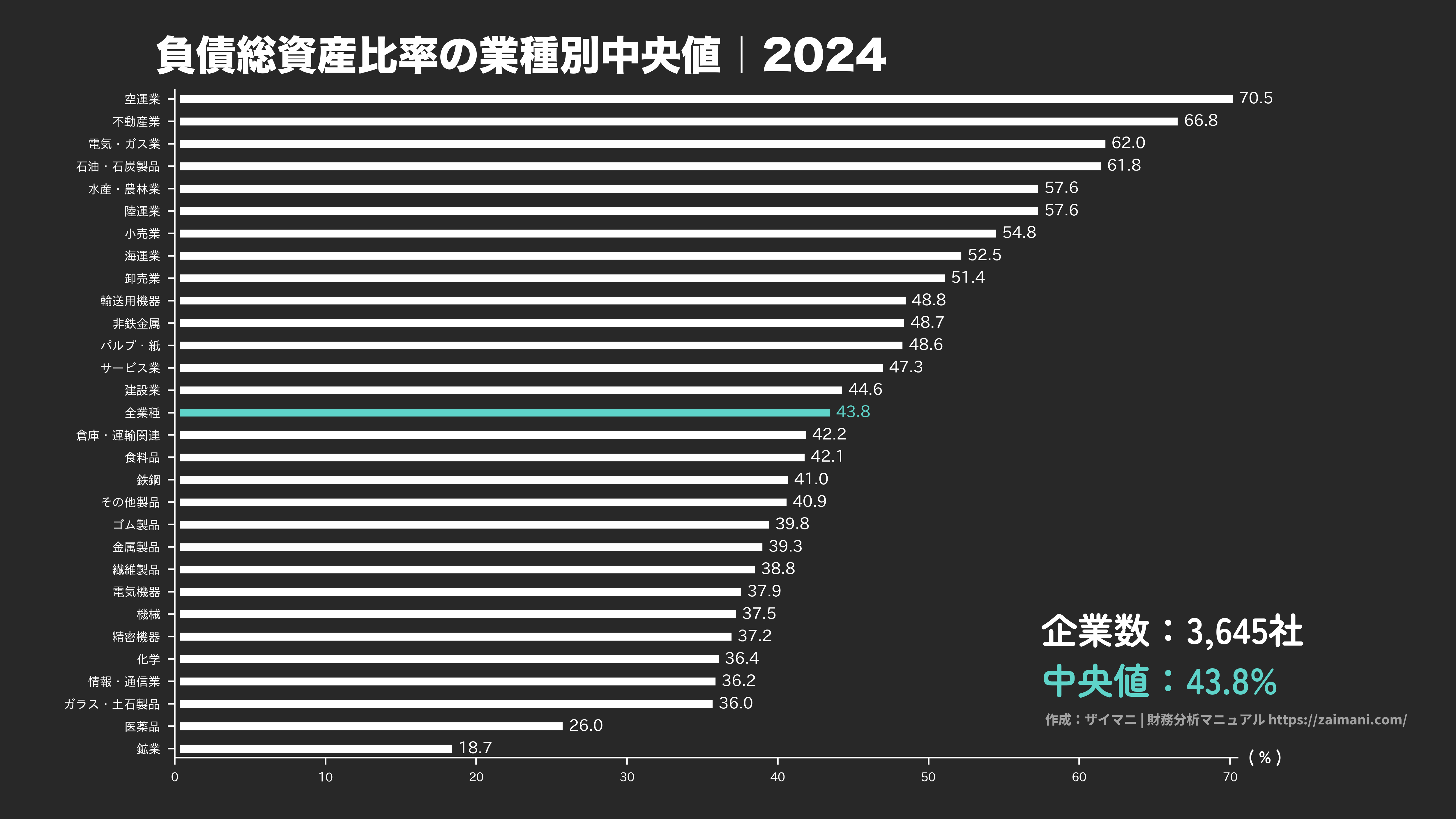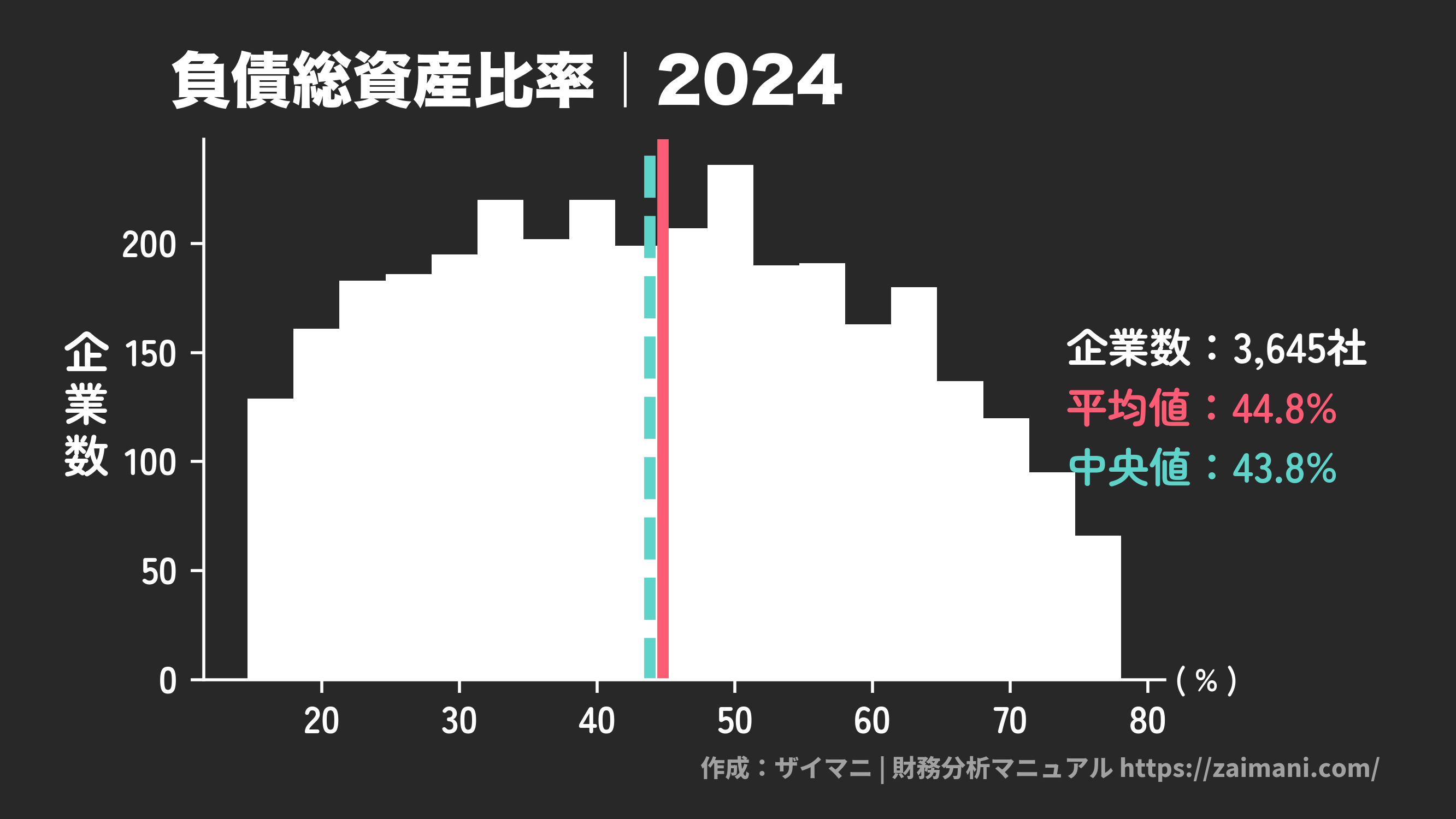 負債総資産比率とは、企業のおおよその財務安全性を測定する指標です。計算式は「負債総資産比率(%) = 負債総額 ÷ 総資産」であり、全業種の中央値(目安)は43.8%です。