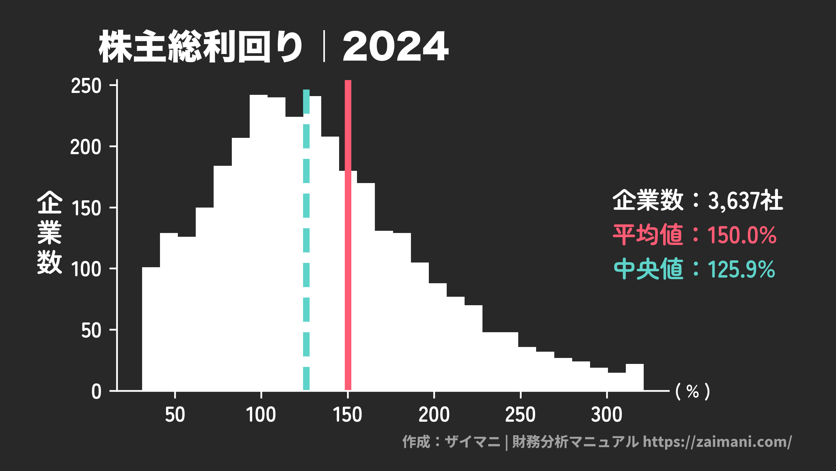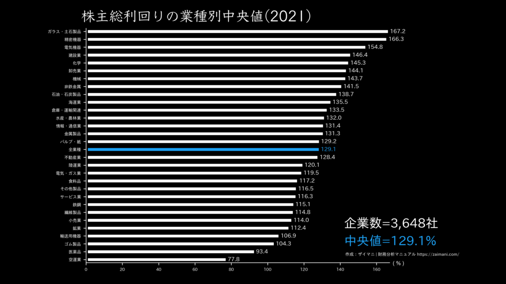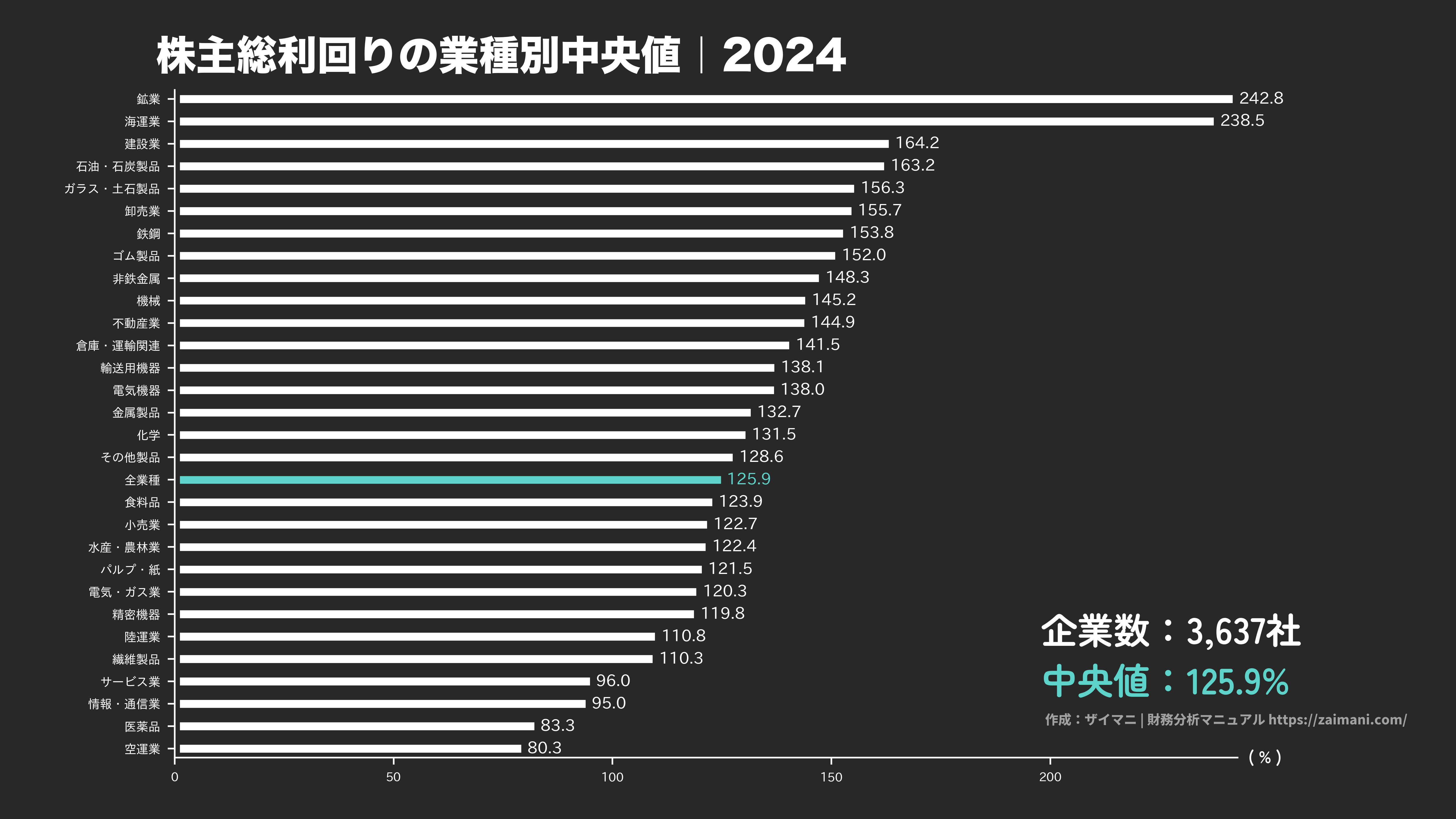 TSRとは、投資家に対する総合的なリターン(値上がり益+配当金)を測定する指標です。計算式は「TSR(%) = 株価増加率 + 配当利回り」であり、全業種の中央値(目安)は125.9%です。