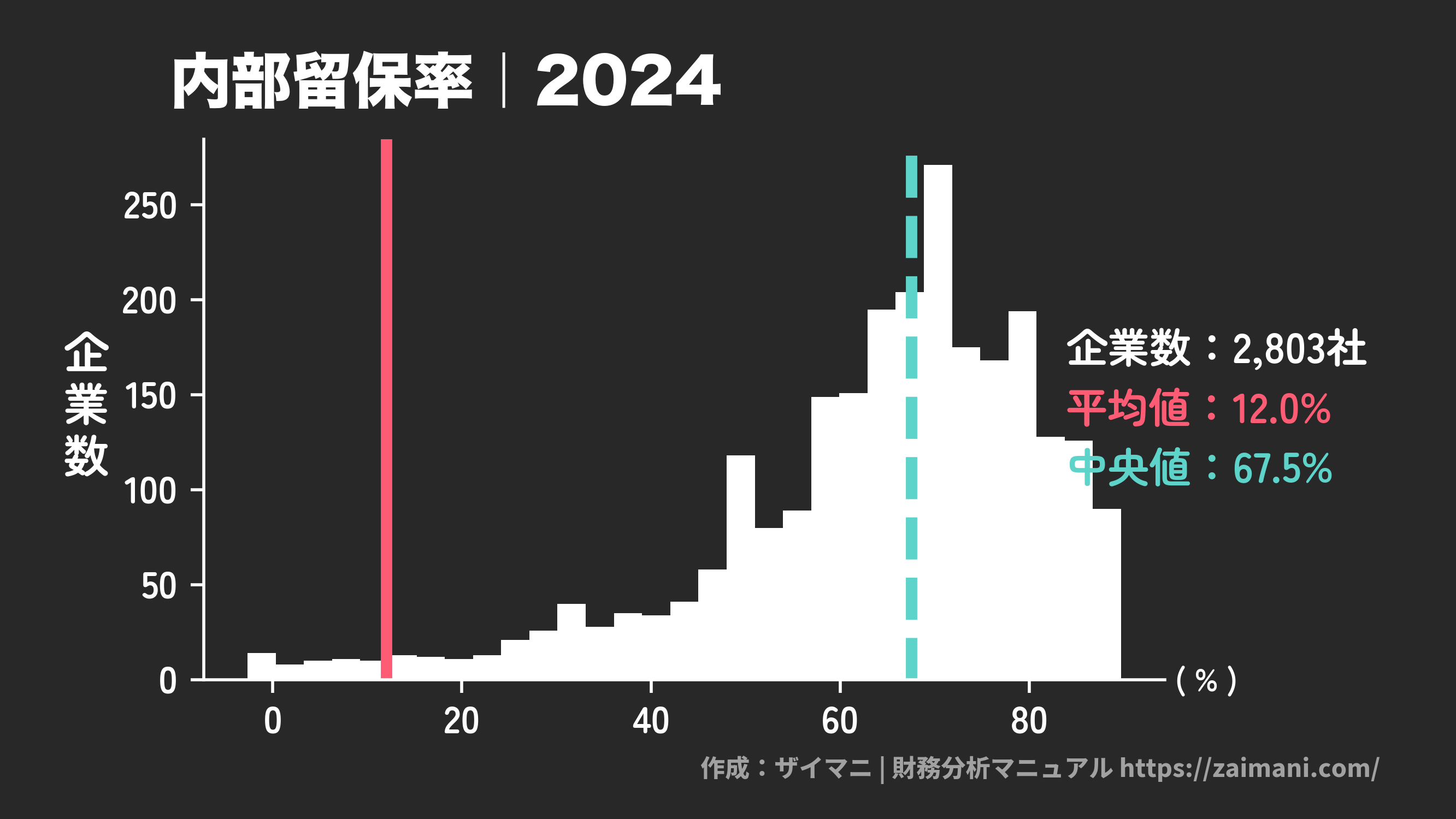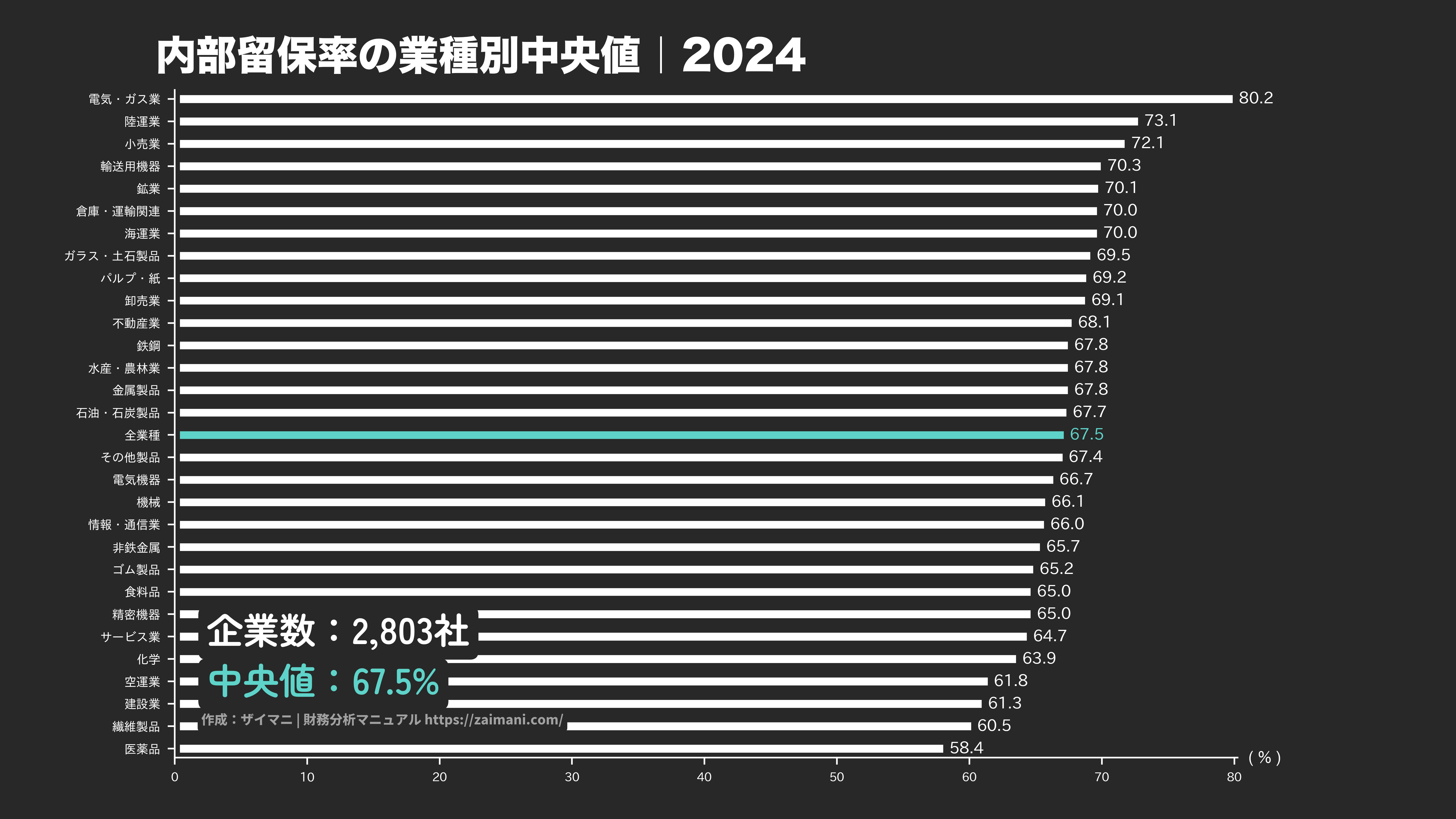 内部留保率とは、企業の内部留保(当期純利益のうち株主への配当金に回されず社内に蓄え られる)割合を測定する指標です。計算式は「内部留保率(%) = 1 – 配当性向」であり、全業種の中央値(目安)は67.5%です。