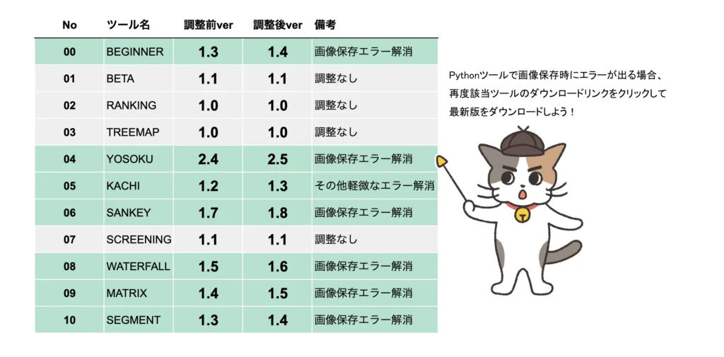 対象ツールにつきましては、エラーを解消したアップデート版の共有を開始しております。お手数をおかけしますが、上記エラーが発生する場合は、お手元にある各ツールのダウンロードリンクをクリックして再度DLをお願いいたします(自動的に最新版がDLされます)。