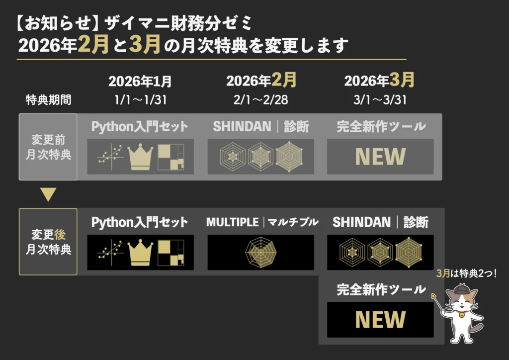 ゼミレポート内容との連動:2026年2月のゼミレポートには、新たに2月の特典となったエクセルツール「MULTIPLE」が登場予定です。解説レポートとツールを組み合わせて活用いただくことで、より深く、実践的な理解につなげていただきたいと考えております。
