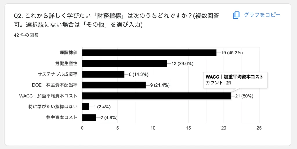 WACC理論株価を学びたい方が多いことが分かりました。次いで労働生産性DOEですね。今後のゼミコンテンツに盛り込んでいきます!